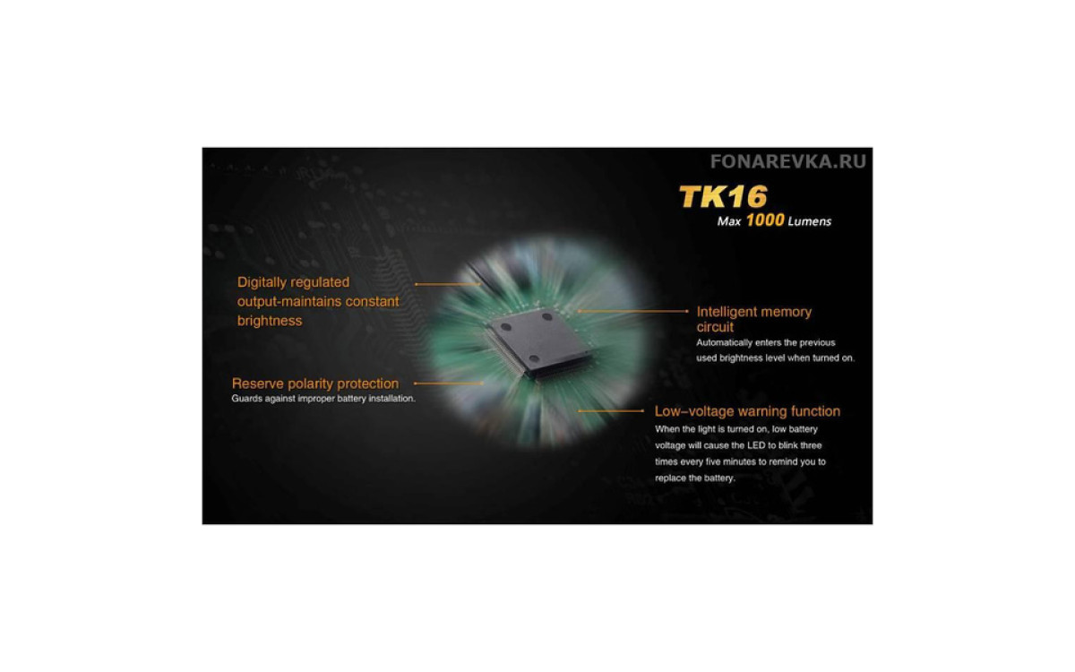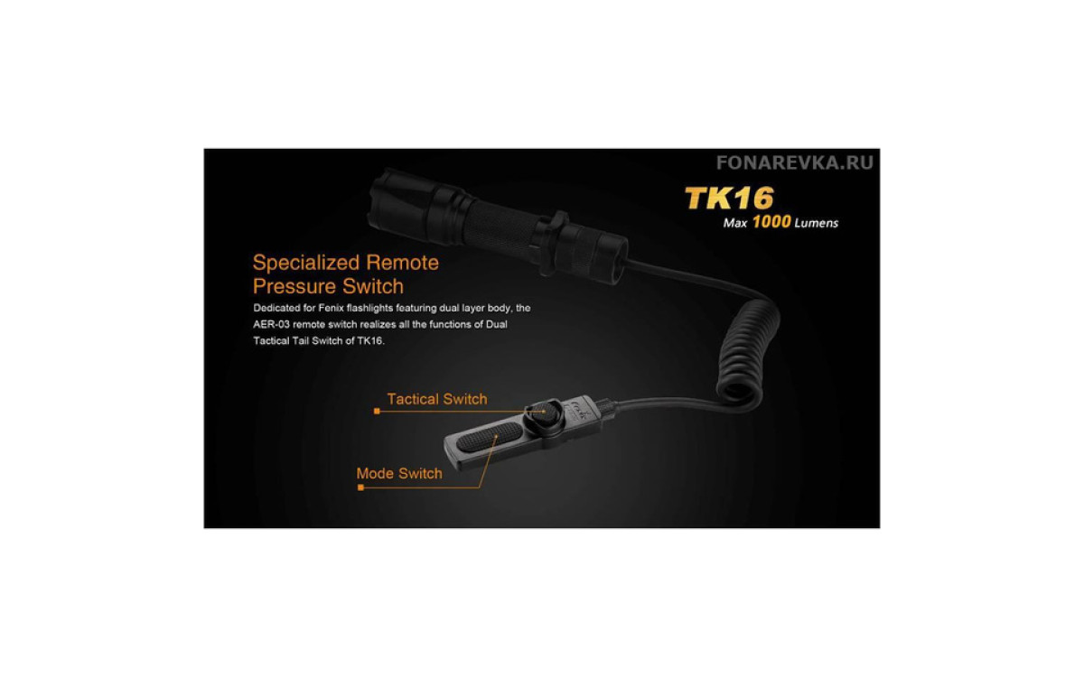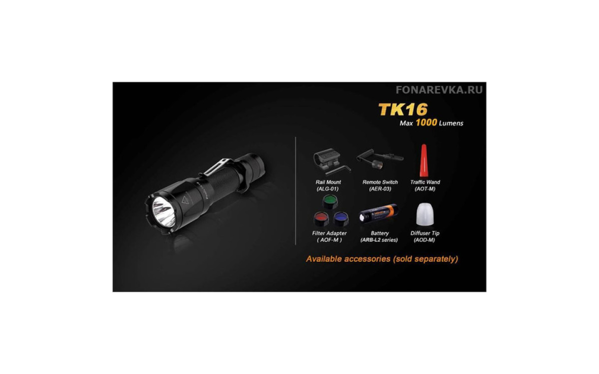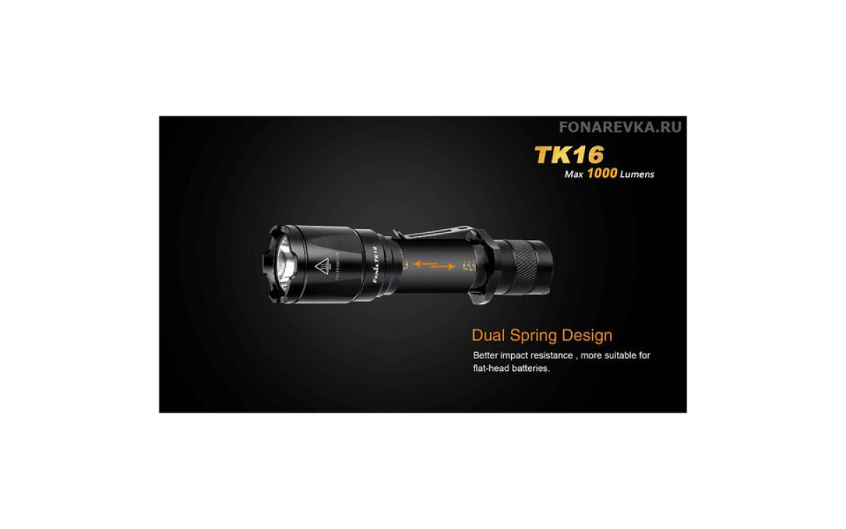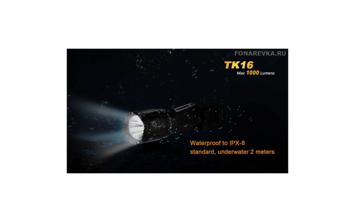 Максимальная яркость Фонаря Fenix TK16 достигает 1000 люмен. Длина дистанции освещения этого дальнобойного фонаря составляет 240 метров. Управление режимами, включая моментальное включение и режим стробоскопа, осуществляется двумя кнопками в хвосте, что обеспечивает надежное и гибкое применение в экстренных ситуациях. Fenix TK16 — сильный тактический фонарь для использования в военных и спец подразделениях, охоте, поисковых работах и т.п., обладающий эргономичным дизайном и надежной конструкцией, прочной ударной кромкой, клипсой на корпусе, кольцом для тактического хвата, богатым выбором тактических аксессуаров. Fenix ТК16 создан с учетом многолетнего опыта проектирования тактических фонарей Fenix, учтены все нюансы использования и улучшены функциональные тактико-технические характеристики.