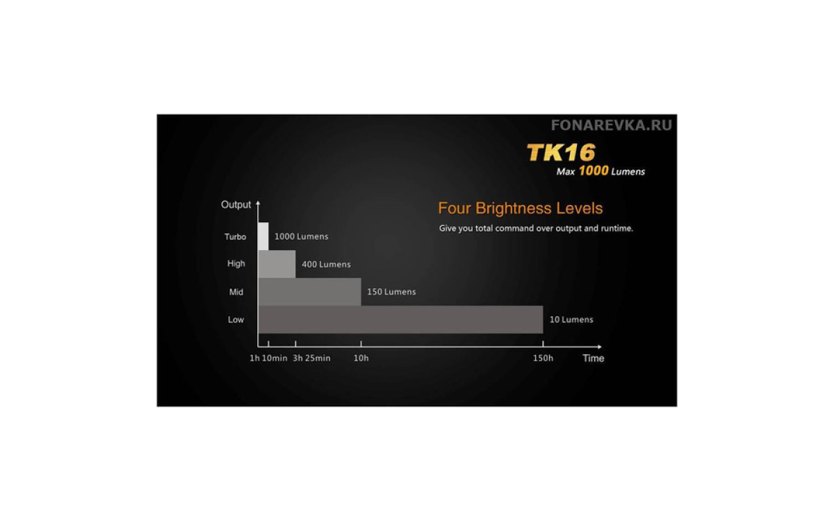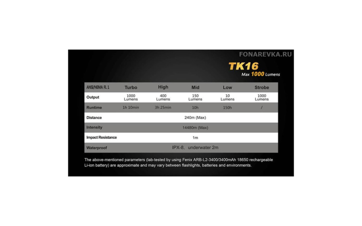| Режимы и время работы: | турбо максимальный средний минимальный стробоскоп | 1000 люмен 400 люмен 150 люмен 10 люмен 1000 люмен | 1 ч 10 мин 3 ч 25 мин 10 часов 150 часов - |