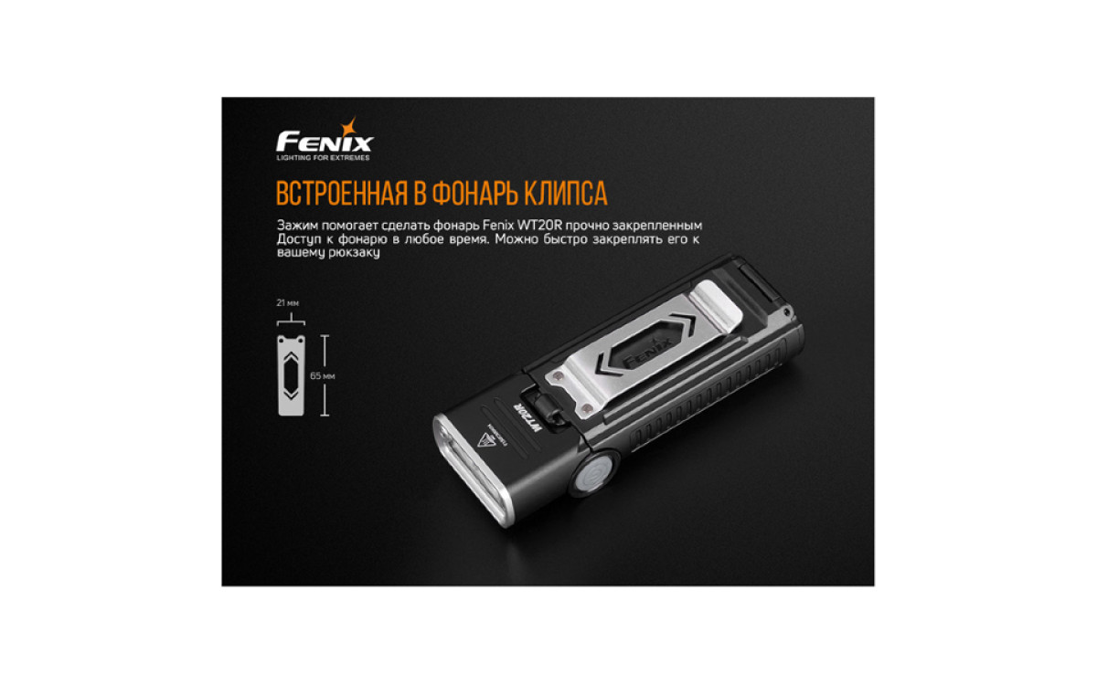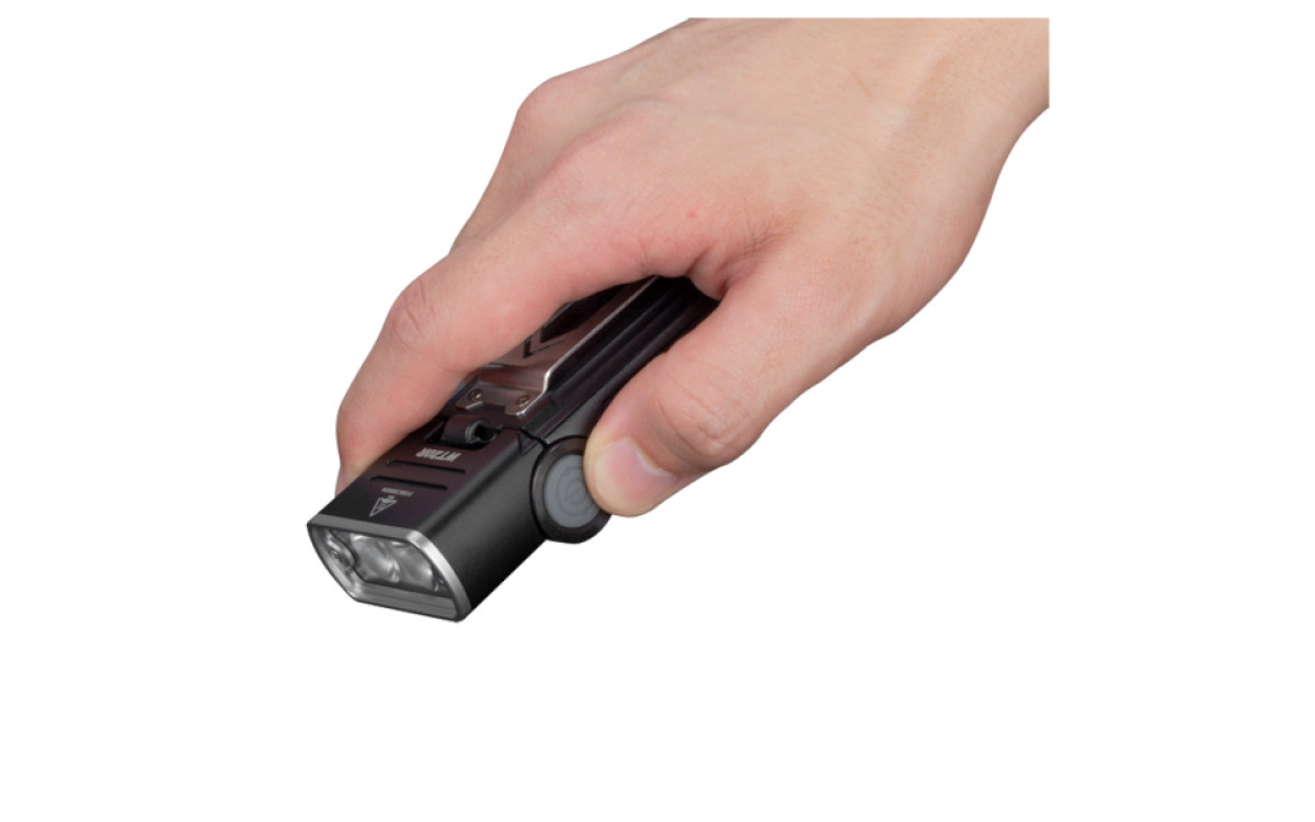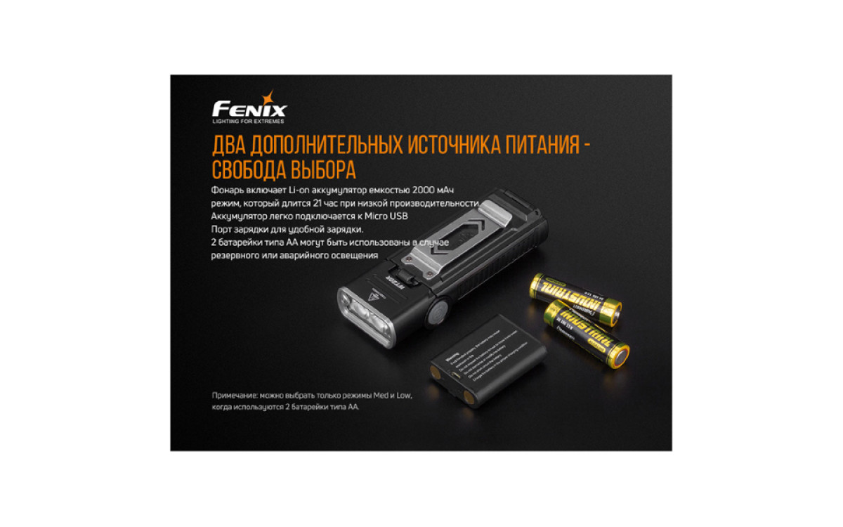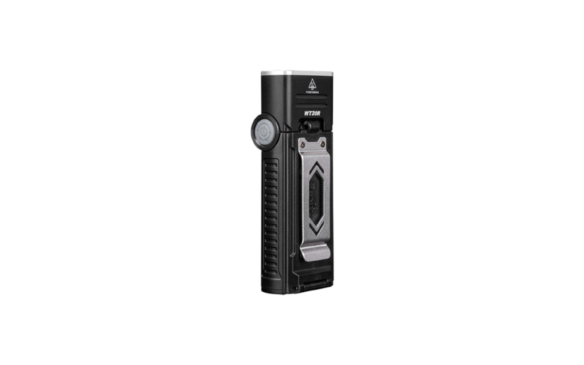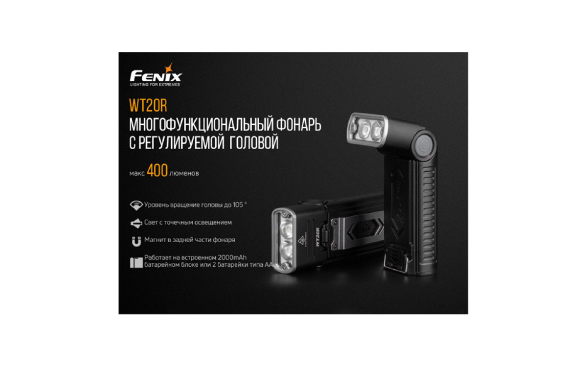Fenix WT20R Г-образный фонарь с двумя источниками света: ближним и дальним, максимальной яркостью 400 люмен. Работает от встроенного Li-Po аккумулятора.