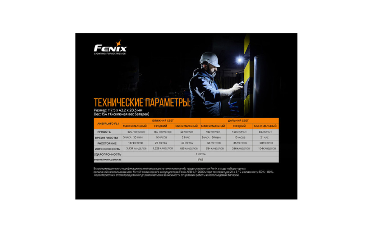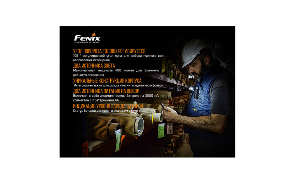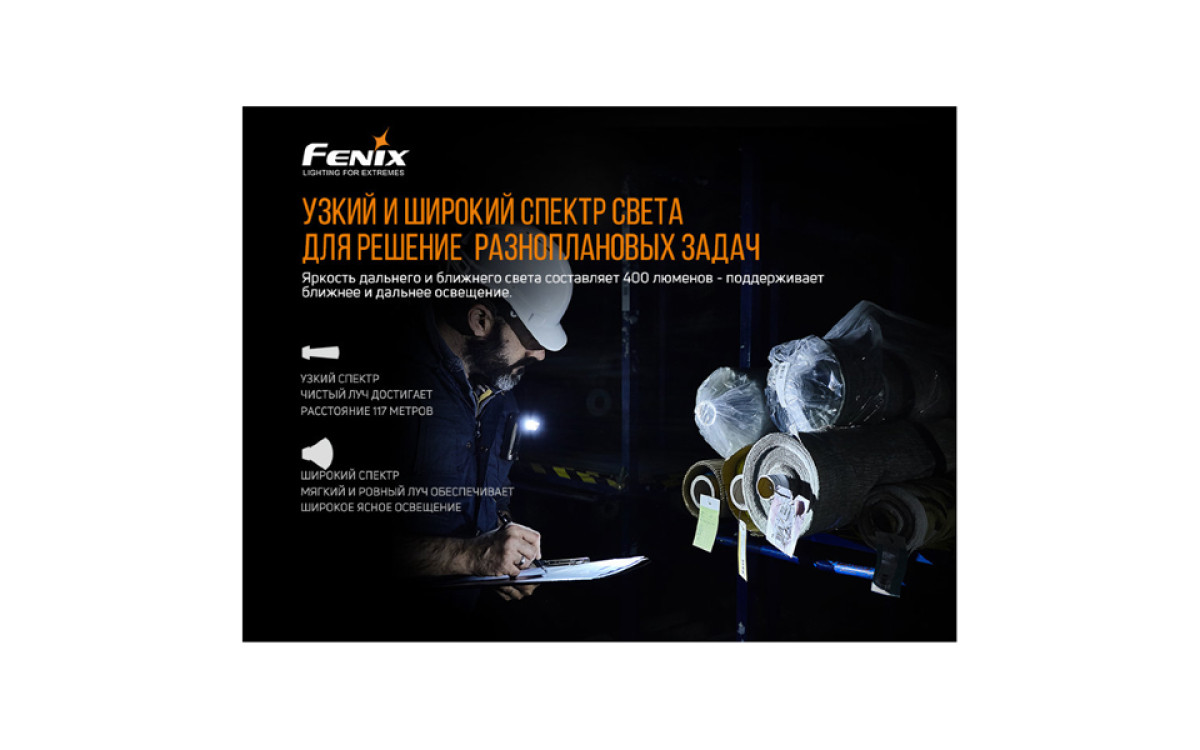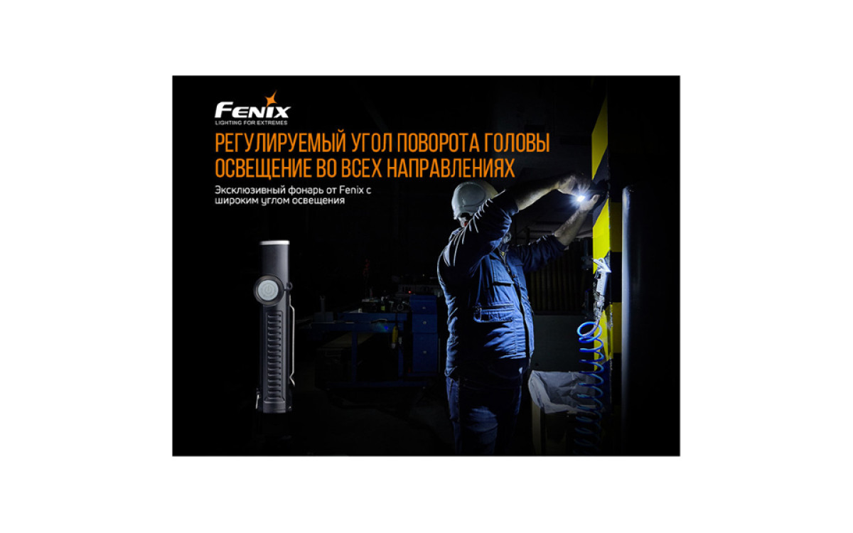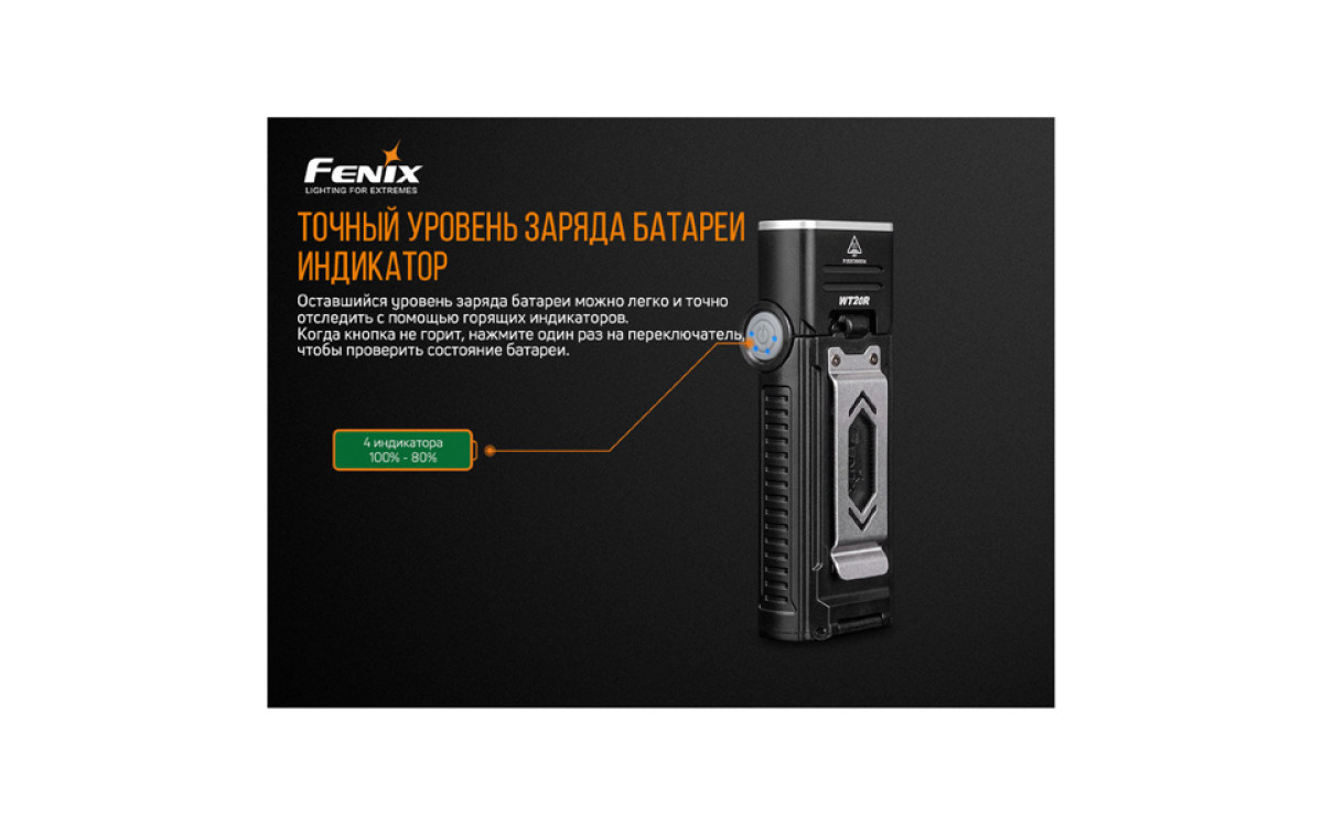 Fenix WT20R Г-образный фонарь с двумя источниками света: ближним и дальним, максимальной яркостью 400 люмен. Работает от встроенного Li-Po аккумулятора.