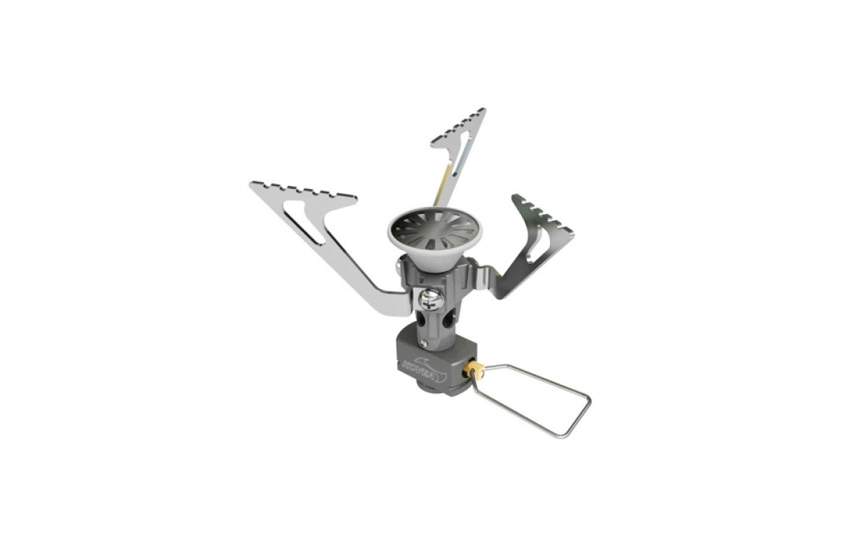 Компактная, облегченная газовая горелка без пьезоподжига (внешний пьезоподжиг входит в комплект). В конструкции применена новая форма головки, которая дает очень мощное, высокое пламя, не задуваемое ветром. Литр воды закипает менее 4-х минут.