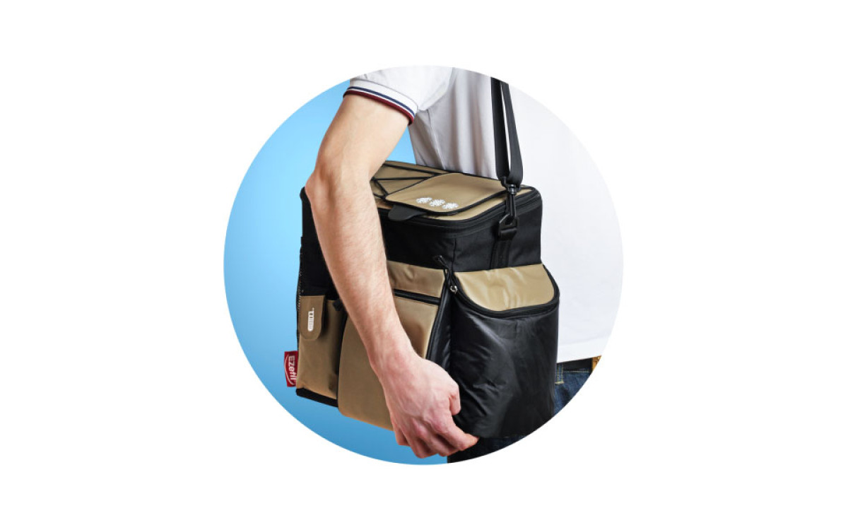 Сетка на крышке фиксирует книгу или бумажные салфетки. Ремень для переноски регулируется по длине и оснащен мягкой плечевой подложкой с нескользящим покрытием, что особенно важно при длительной переноске.