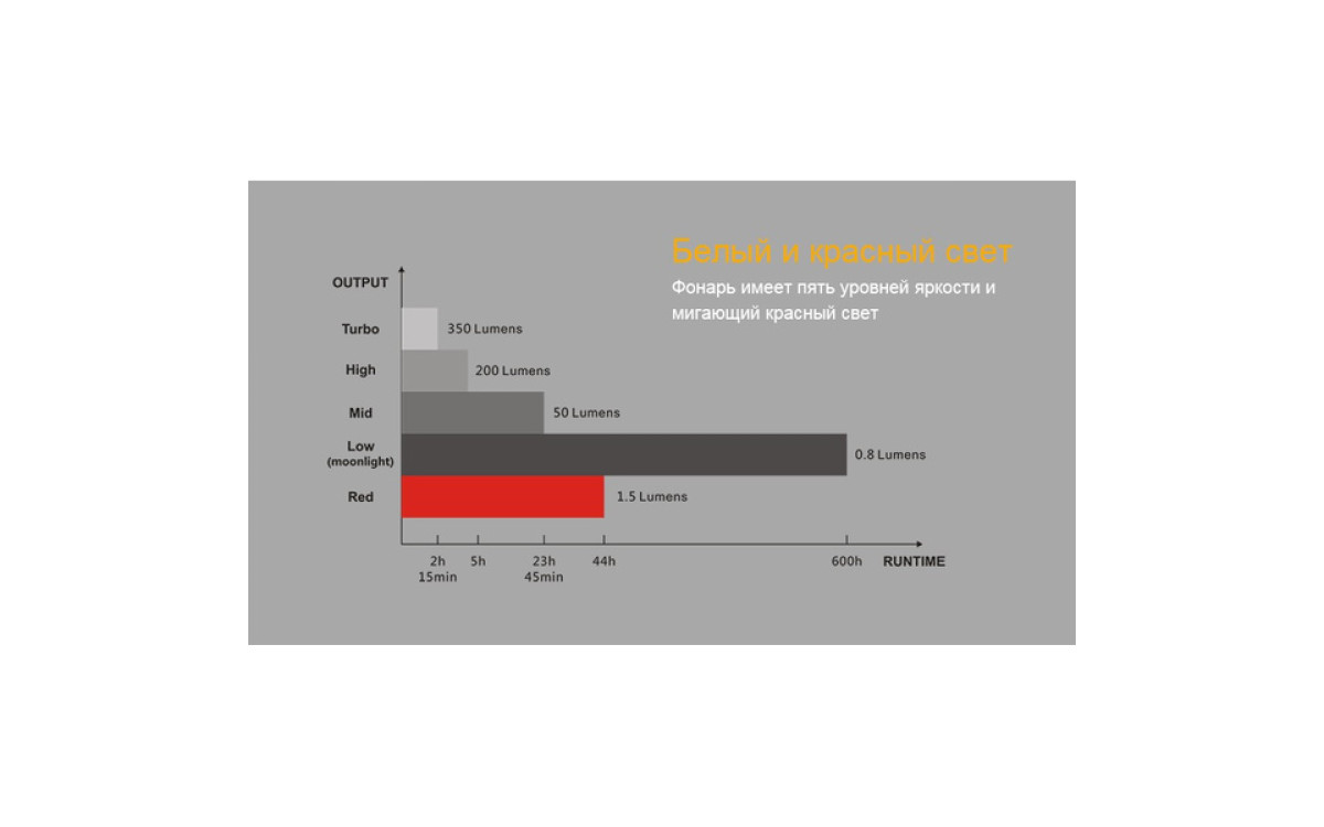 | Режимы и время работы: | турбо максимальный средний минимальный красный красные вспышки |
