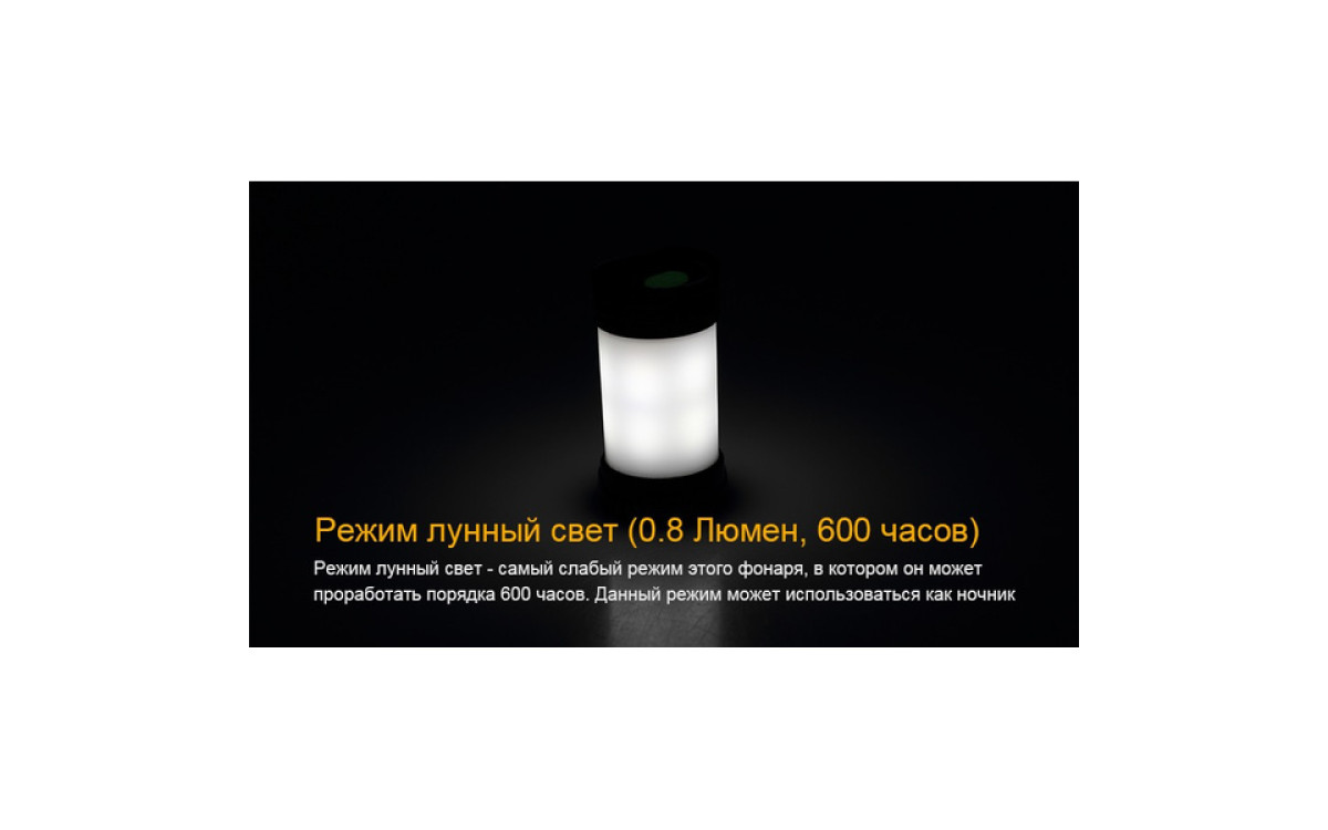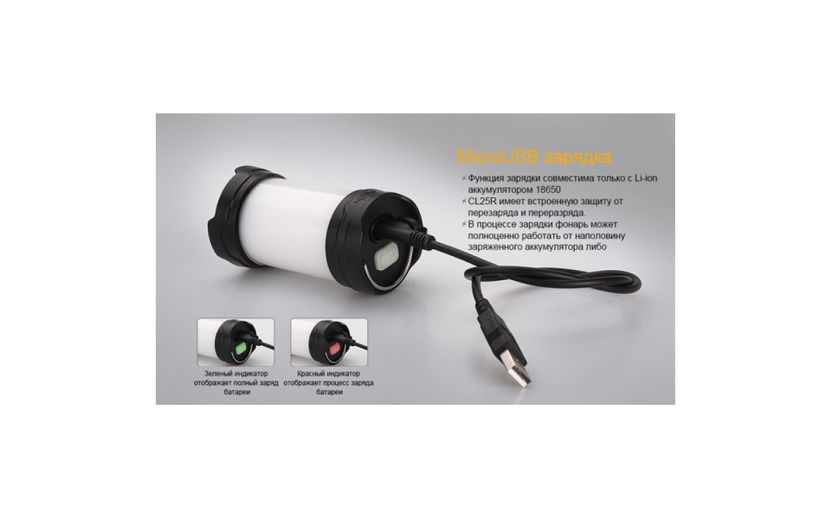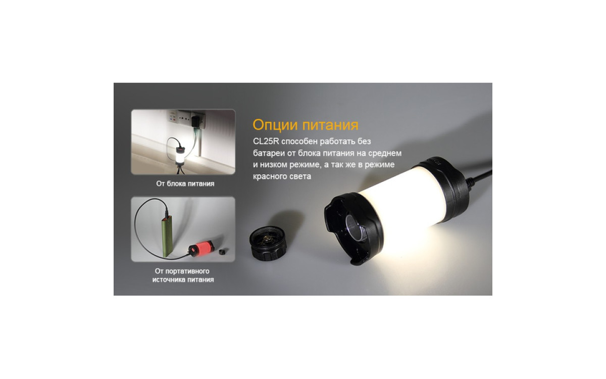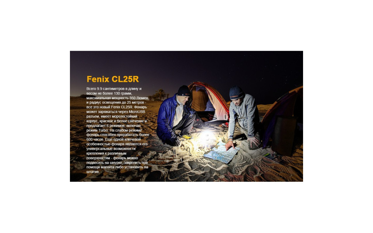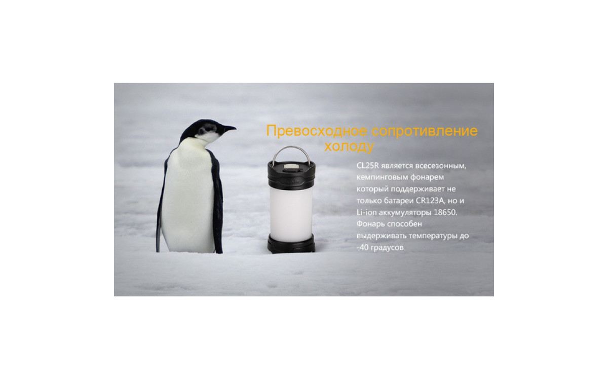 5-сантиметровый кемпинговый светильник CL25R с привычной «домашней» силой света в 350 люмен может быть перенесен в любое место, где требуется освещение. Он освещает пространство вокруг диаметром до 25 метров. В светильнике применяется специальный батарейный отсек, спроектированный для работы при низких температурах. 6 режимов яркости в CL25R, включая лунный свет и красный свет, могут работать как от двух батарей CR123A либо одного аккумулятора 18650, так и от USB зарядки от сети либо переносного источника питания. CL25R оснащен встроенной петлей, гнездом под штатив и магнитом для функционального и удобного крепления.