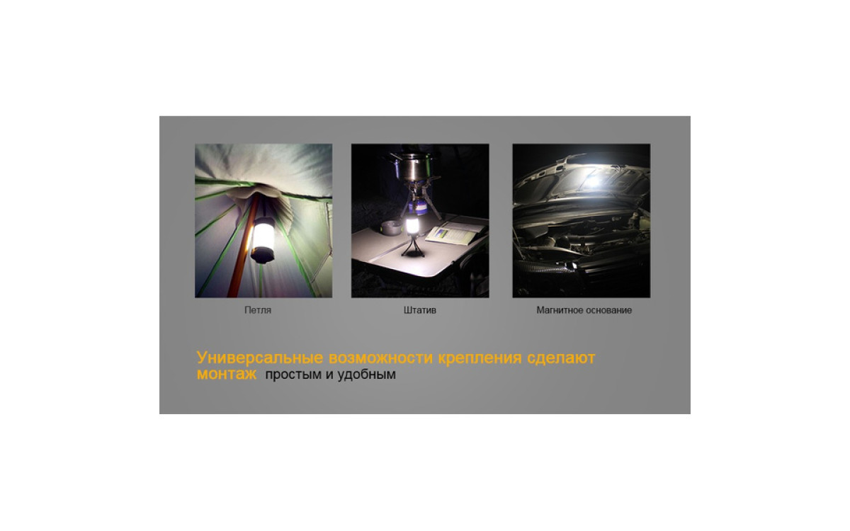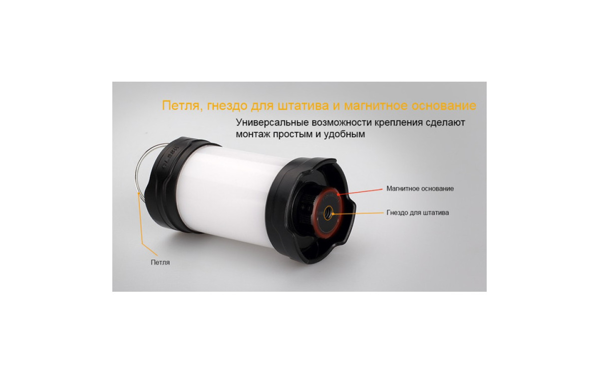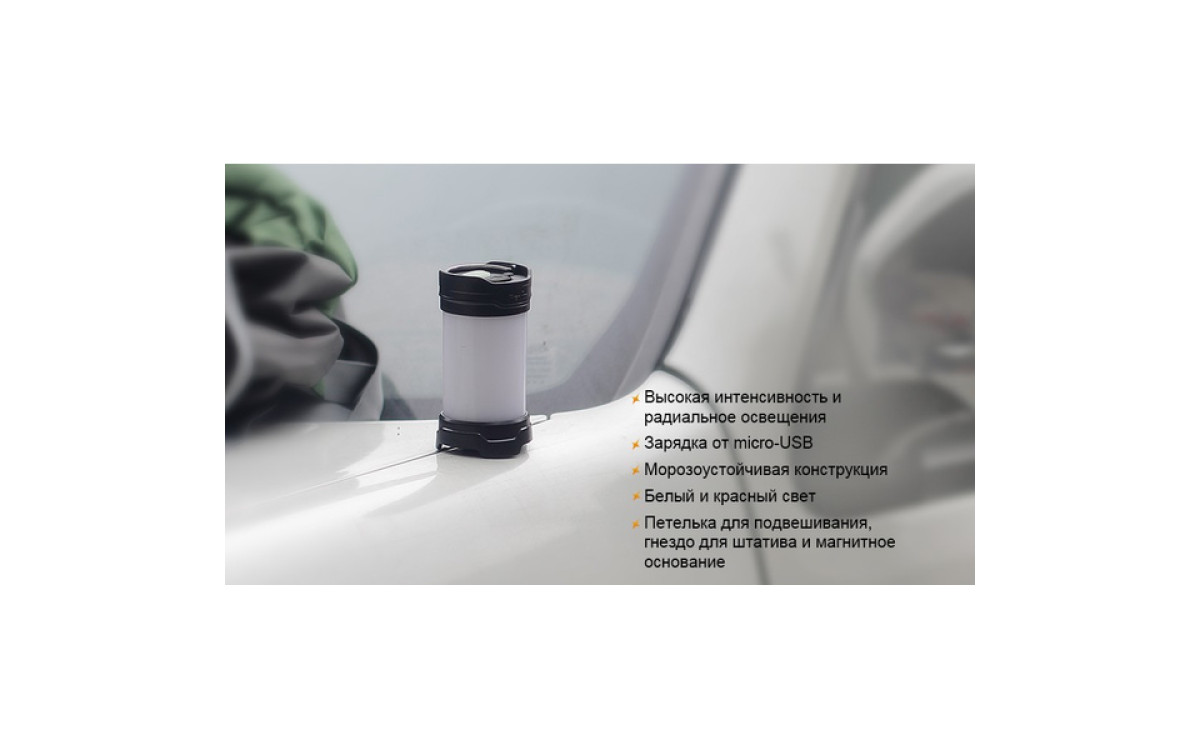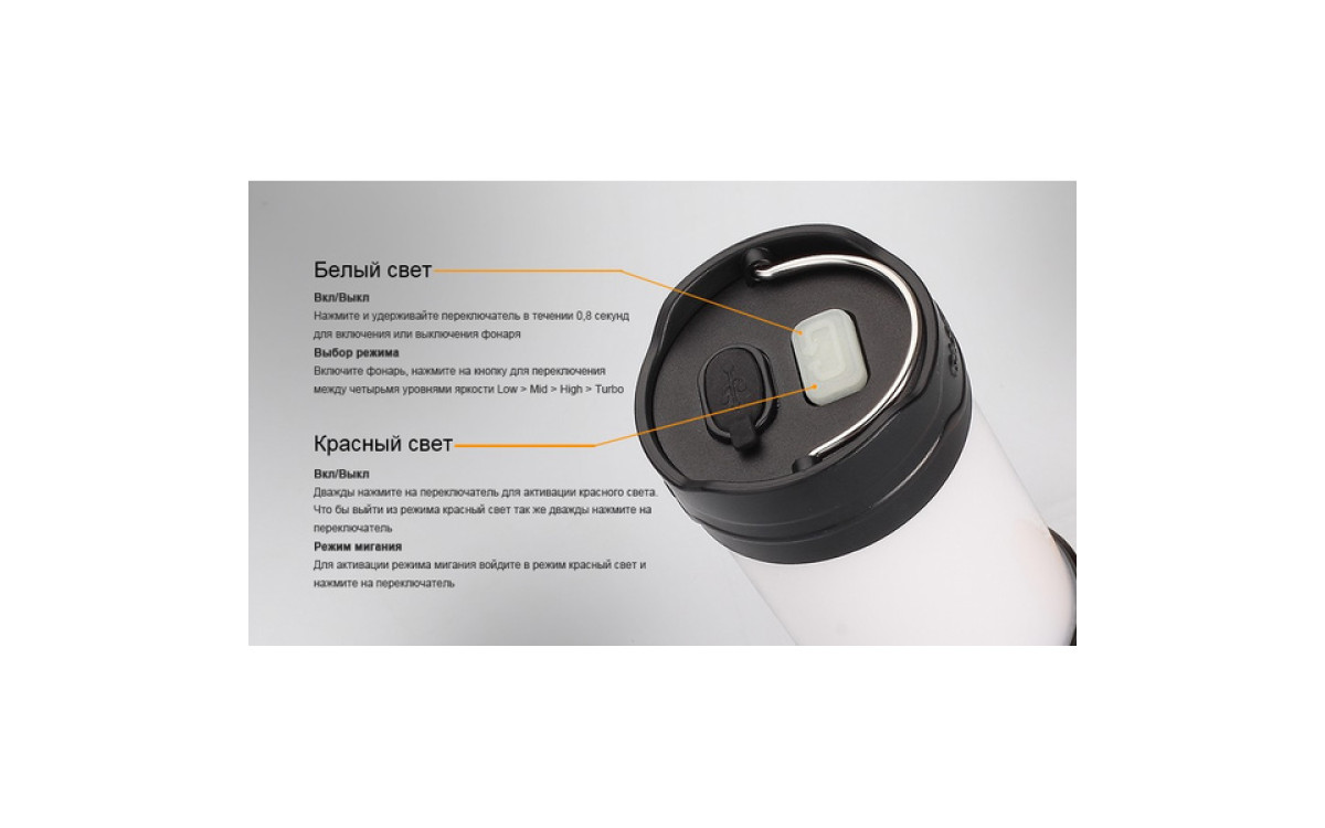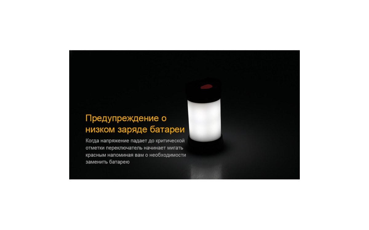 5-сантиметровый кемпинговый светильник CL25R с привычной «домашней» силой света в 350 люмен может быть перенесен в любое место, где требуется освещение. Он освещает пространство вокруг диаметром до 25 метров. В светильнике применяется специальный батарейный отсек, спроектированный для работы при низких температурах. 6 режимов яркости в CL25R, включая лунный свет и красный свет, могут работать как от двух батарей CR123A либо одного аккумулятора 18650, так и от USB зарядки от сети либо переносного источника питания. CL25R оснащен встроенной петлей, гнездом под штатив и магнитом для функционального и удобного крепления.