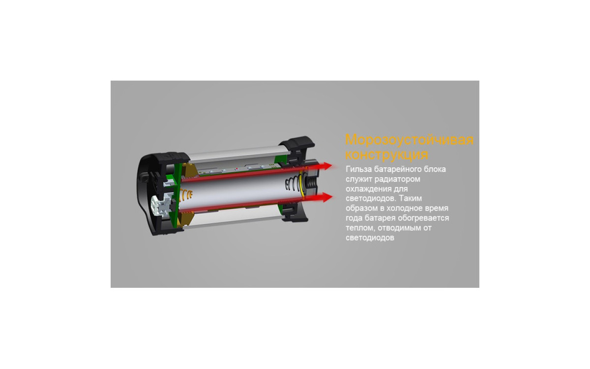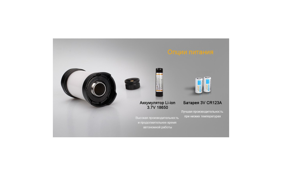 - Работа на литии — один 18650 Li-ion аккумулятор или 2 батарейки CR123A