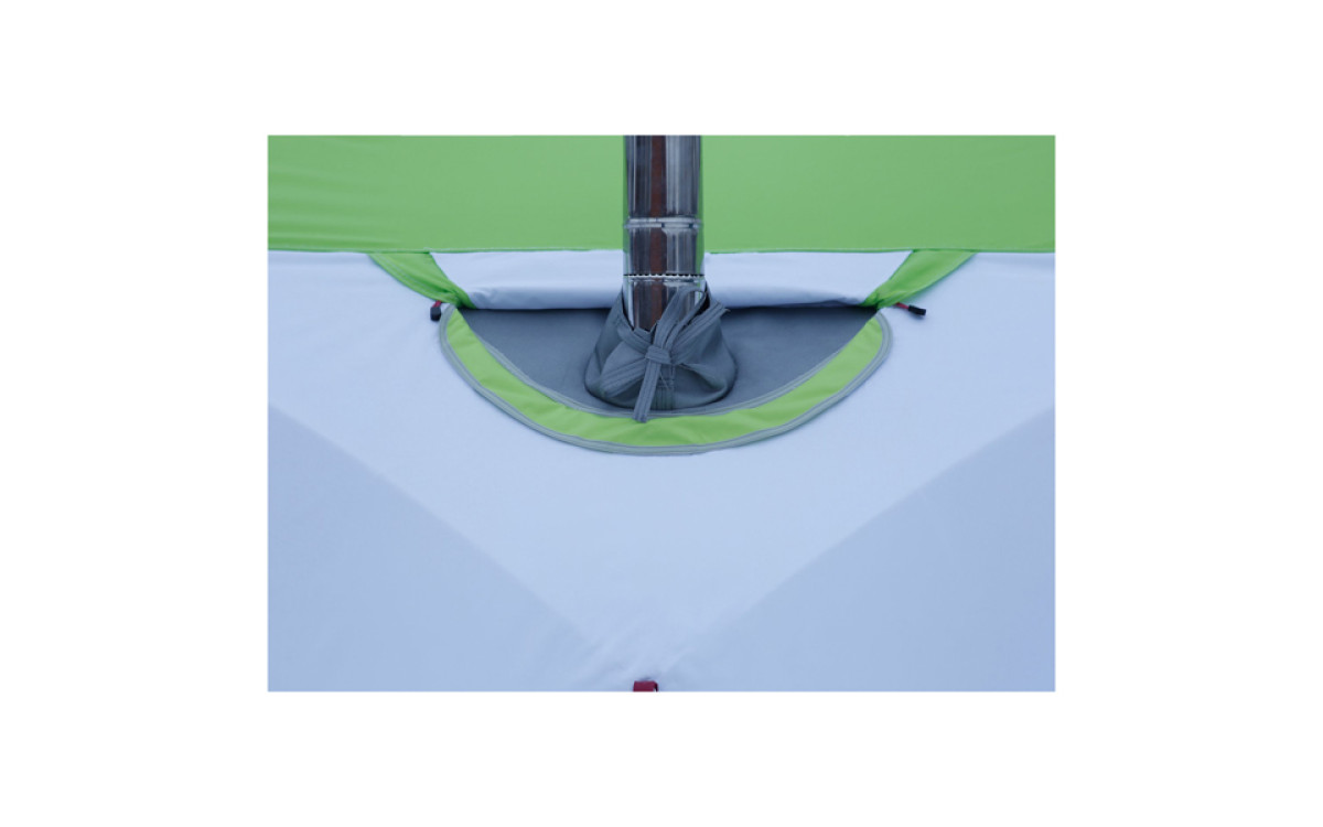 - С внутренней стороны клапан оснащен защитной термостойкой шторкой, которая крепится к дугам каркаса с небольшим воздушным зазором от стенки палатки и защищает ее от нагрева отопительной печью.