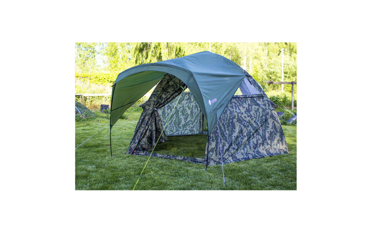 Козырек ЛОТОС 5 образует удобный навес перед входом в палатку. Козырек легко и быстро крепится к куполу и хорошо защищает вход в палатку от дождя, ветра и солнца.