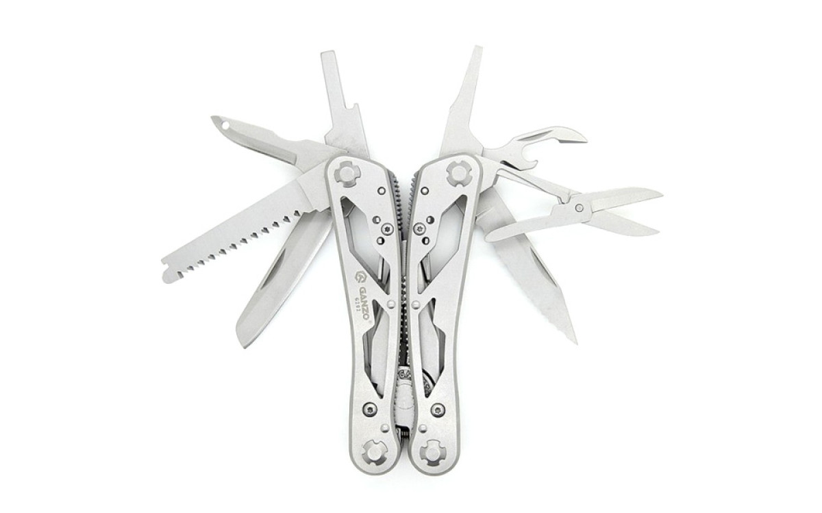 Стильный мультитул G202 от компании Ganzo. Модель имеет продуманный дизайн и большой набор инструментов. В комплект входят следующие предметы: подпружиненные плоскогубцы с кусачками, два лезвия, одно из которых имеет серрейторную заточку, плоская отвертка небольшого размера, ножницы, ножовка по дереву, зенковка, удлинитель адаптера для бит открывалки для бутылок и консервов.