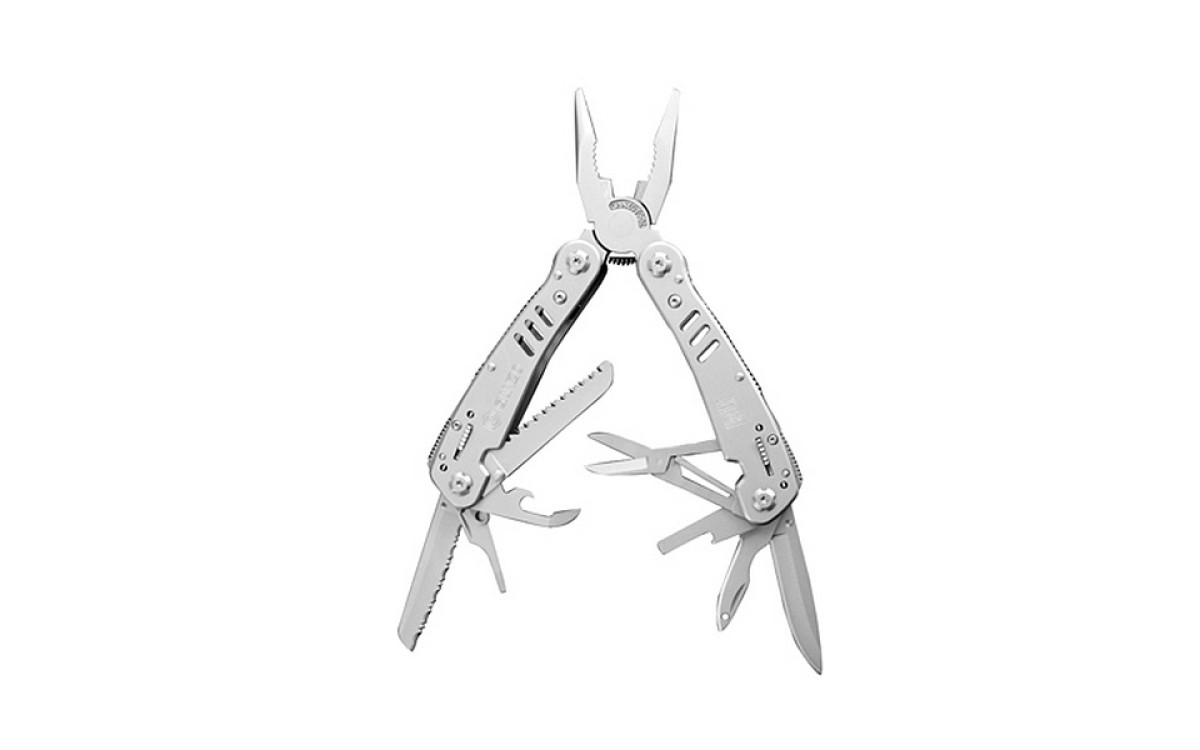 Удобный полноразмерный мультитул G301 от компании Ganzo. Большой набор инструментов позволяет использовать модель G301 для полноценного ремонта разнообразной техники. В комплект мультитула G301 входят следующие инструменты: подпружиненные плоскогубцы с кусачками, два лезвия, одно из которых имеет серрейторную заточку, две плоских отвертки разного размера, пилу по дереву, ножницы, зенковку, удлинитель для адаптера, консервный нож.