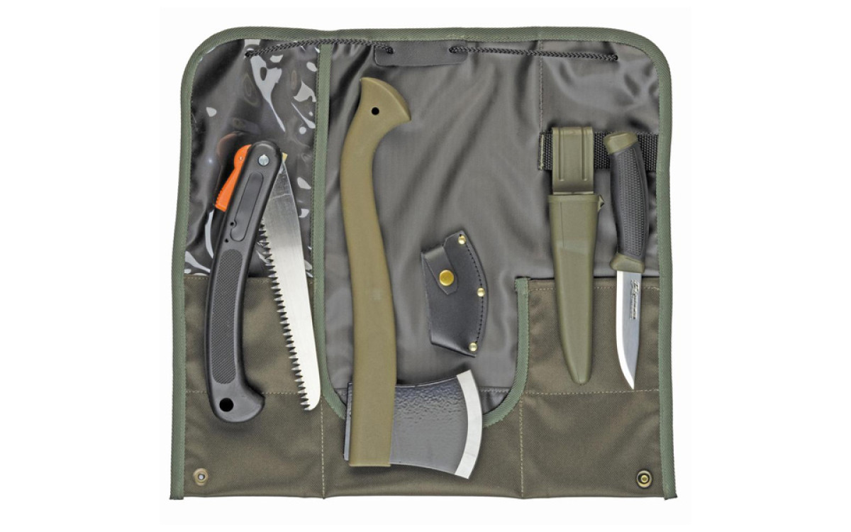 Набор, состоящий из ножа Mora Companion MG, топора Mora Camp Axe и складной пилы. Упакован в кордуровый чехол.