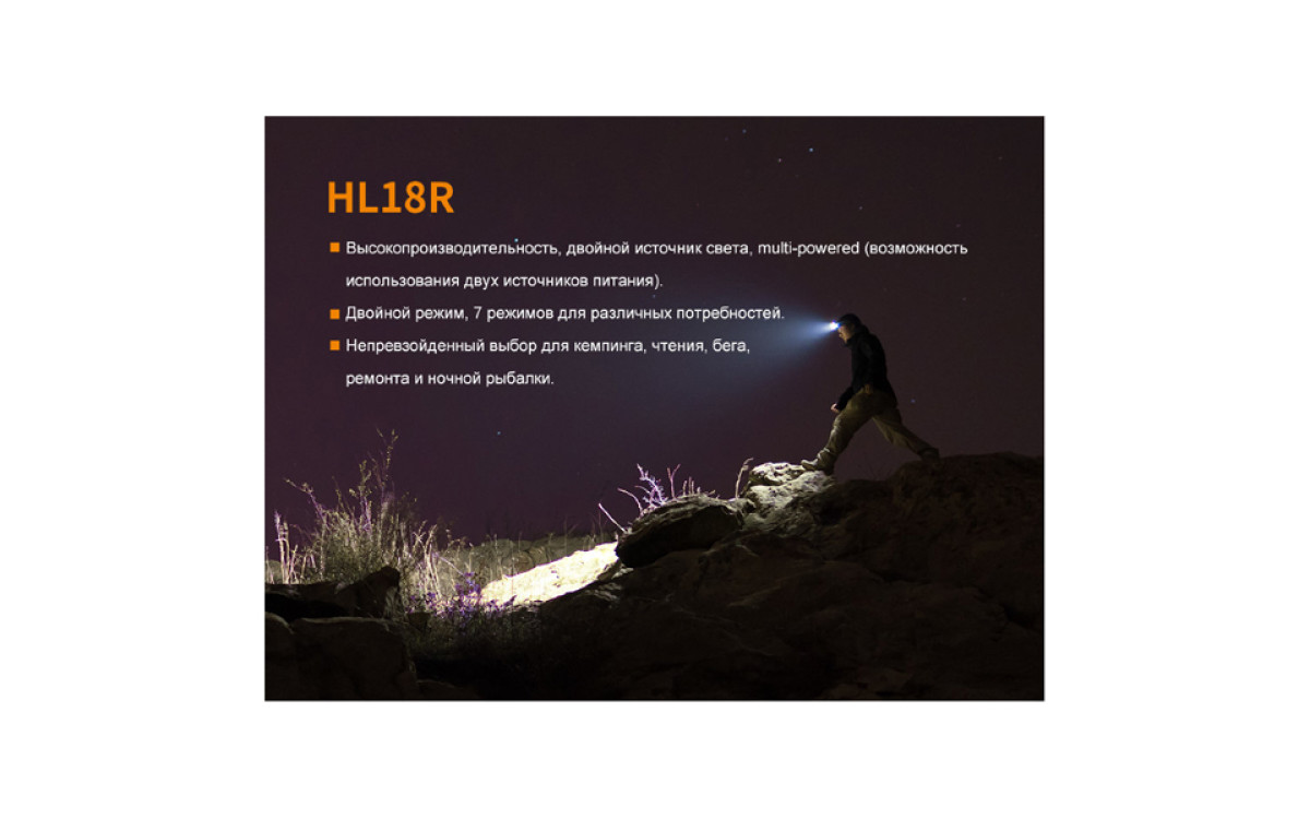 Fenix HL18R - эффективный налобный фонарь, работающий от различных источников питания. В нем есть 2 группы режимов (дальнего и ближнего света) и 7 режимов яркости для широкого спектра задач. Fenix HL18R отлично подойдет для чтения, отдыха на природе, бега и другой активной деятельности.
