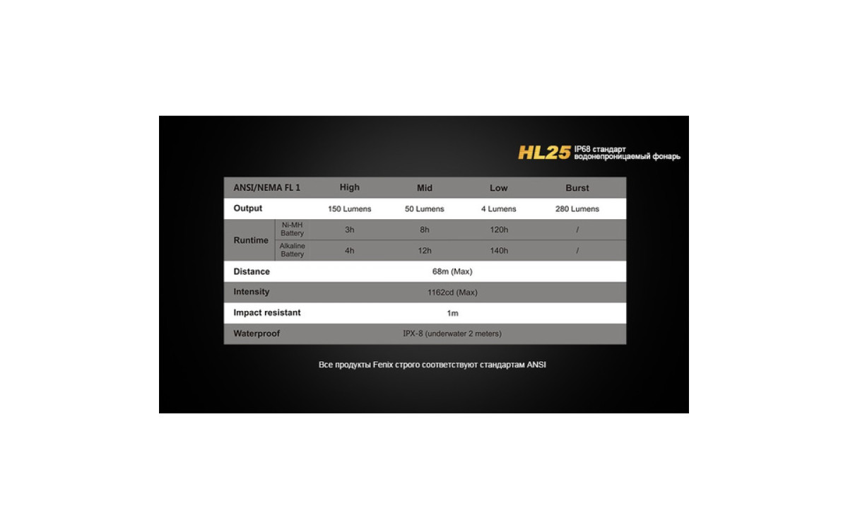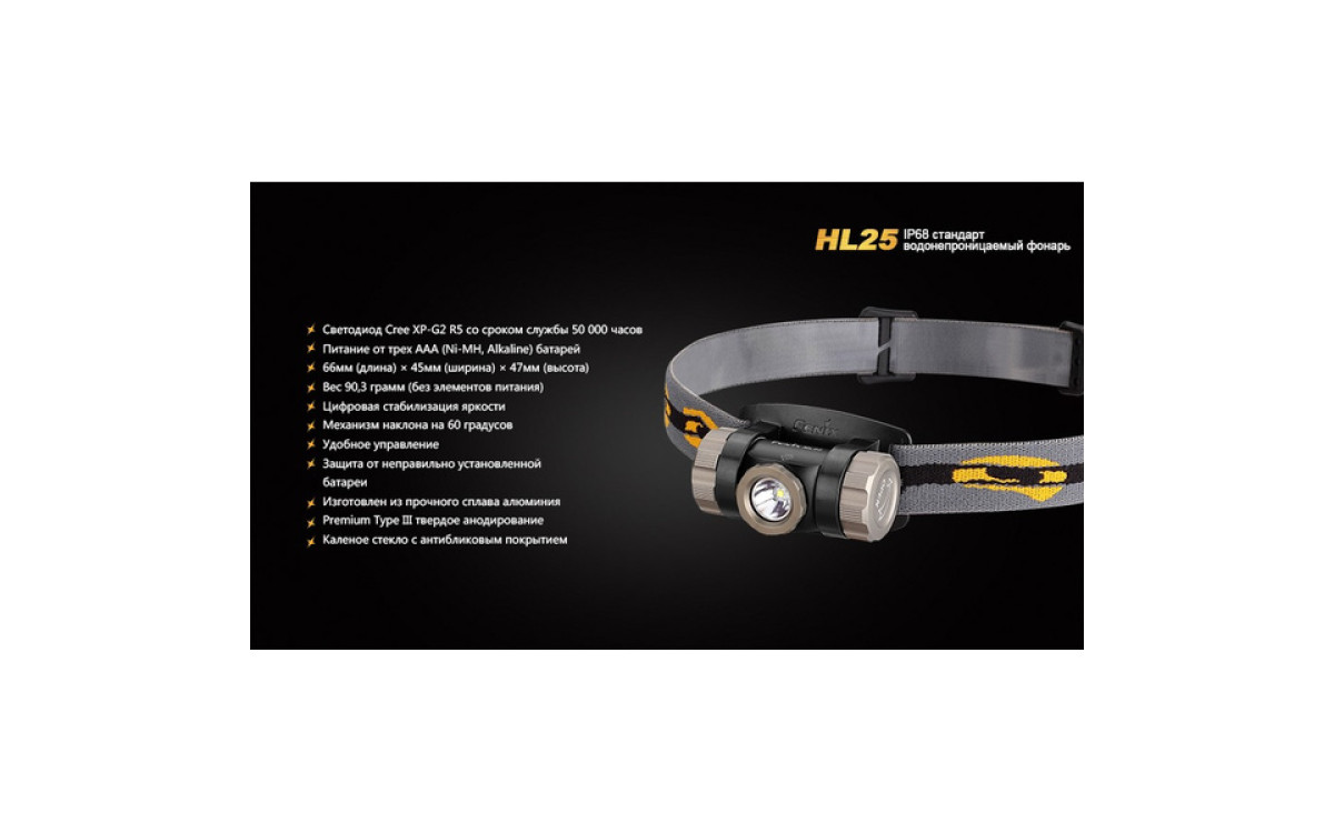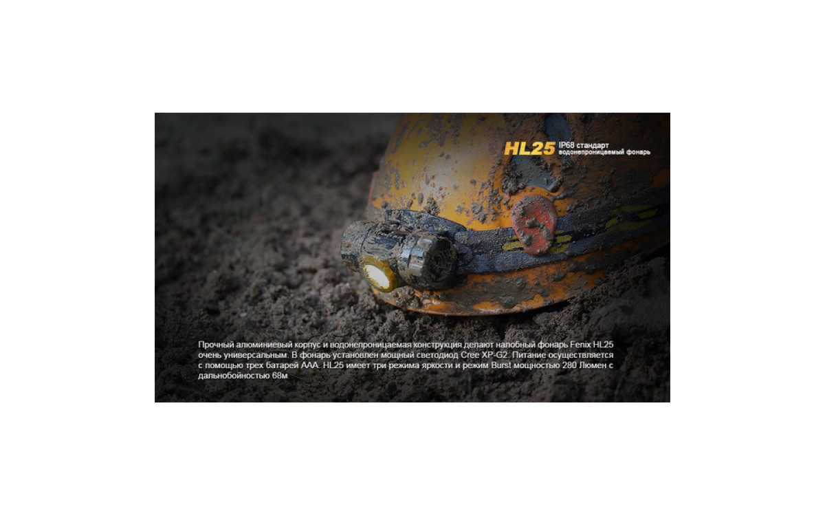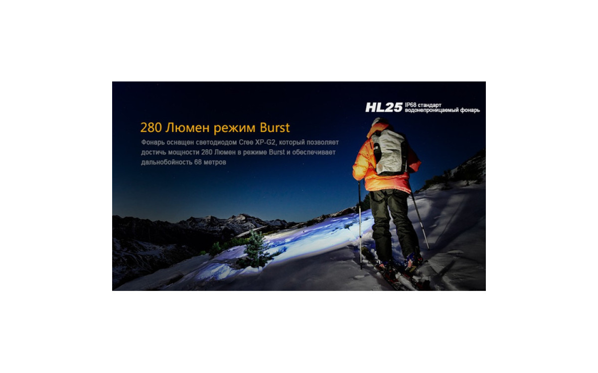 Обладая прочным алюминиевым корпусом и водонепроницаемой конструкцией, Fenix HL25 готов к любым ударам и падениям. Вооруженный мощным светодиодом и энергией 3-х батареек ААА, фонарь обеспечивает световой поток максимальной мощностью 280 люмен и дальностью 68 метров. Вкупе с 3-мя режимами яркости и Турбо режимом этот налобник — отличный выбор для ночных приключений.
