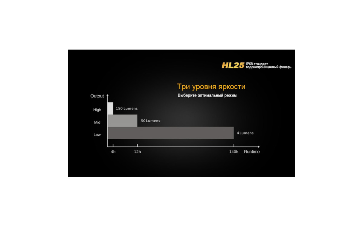 | Режимы и время работы: | турбо максимальный средний минимальный | 280 люмен 150 люмен 50 люмен 4 люмен | - 4 часа 12 часов 140 часов |