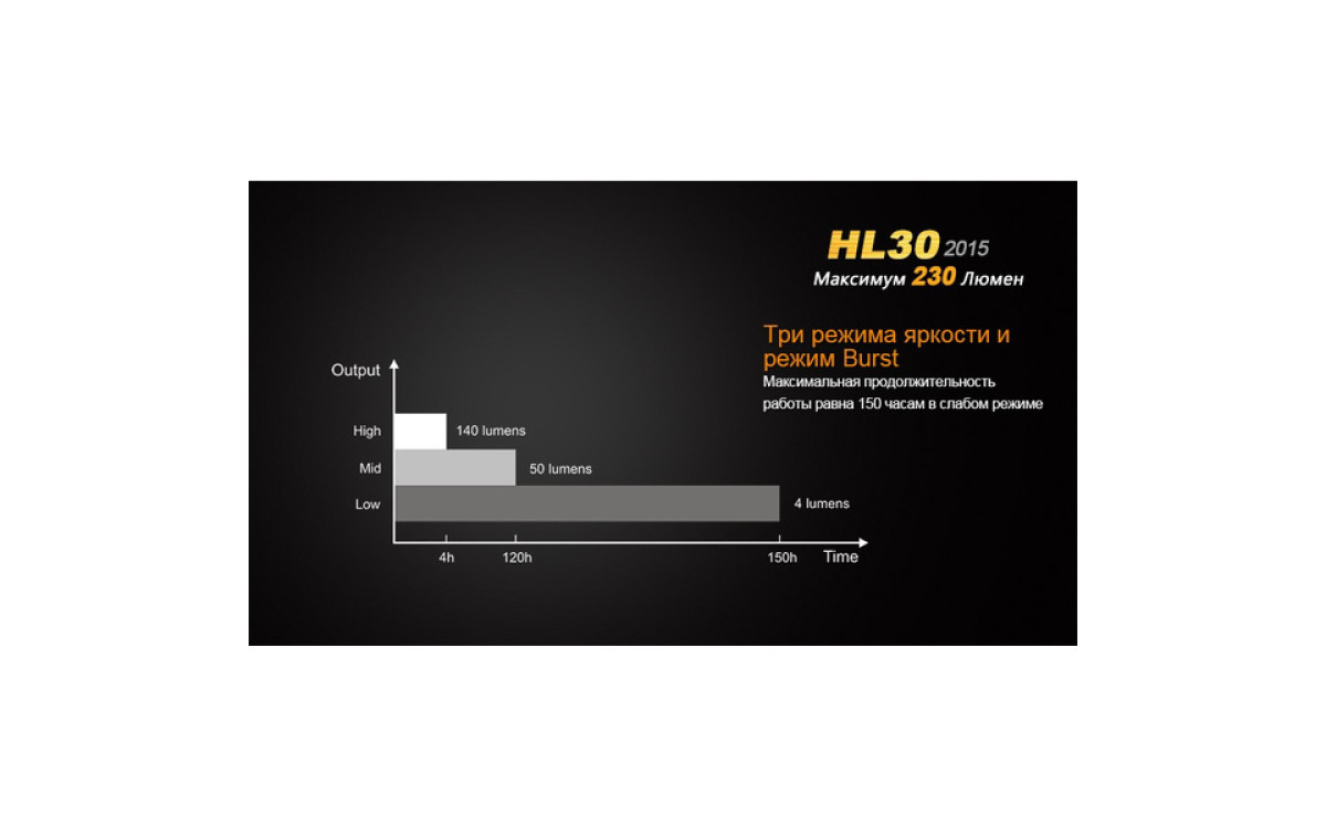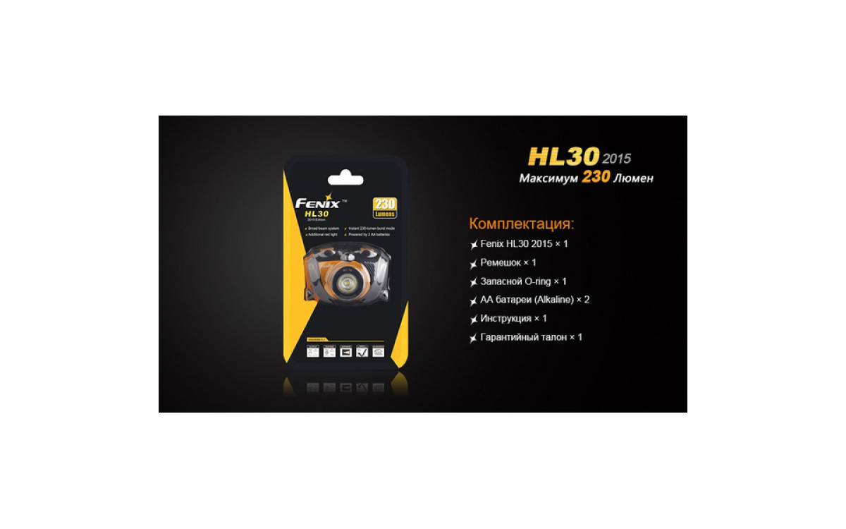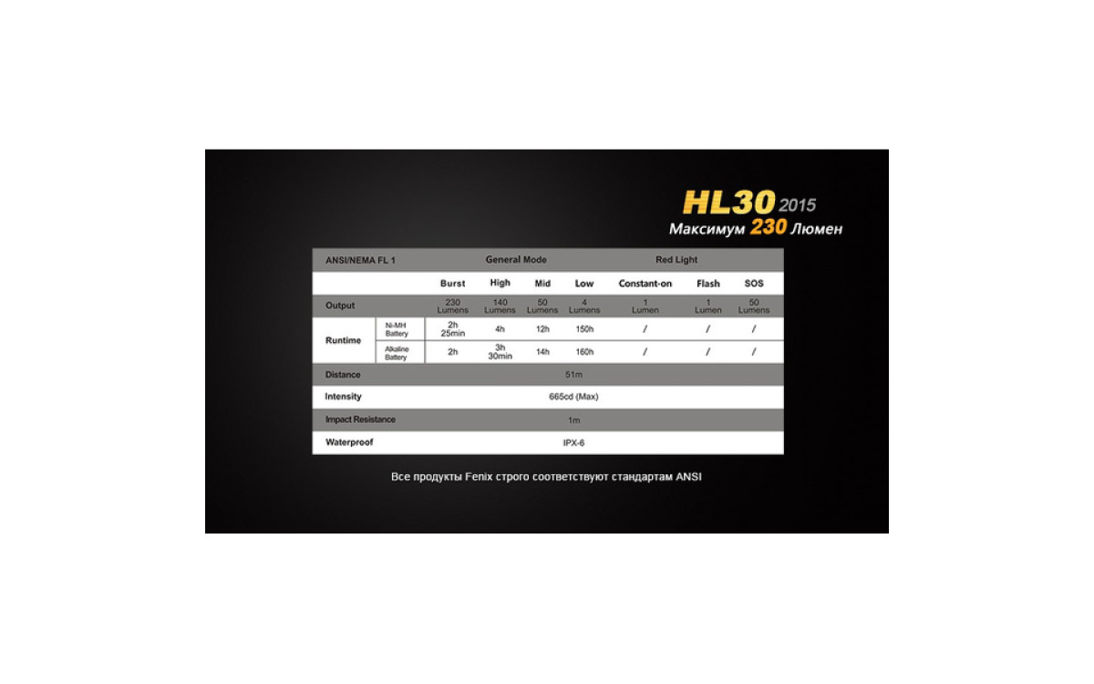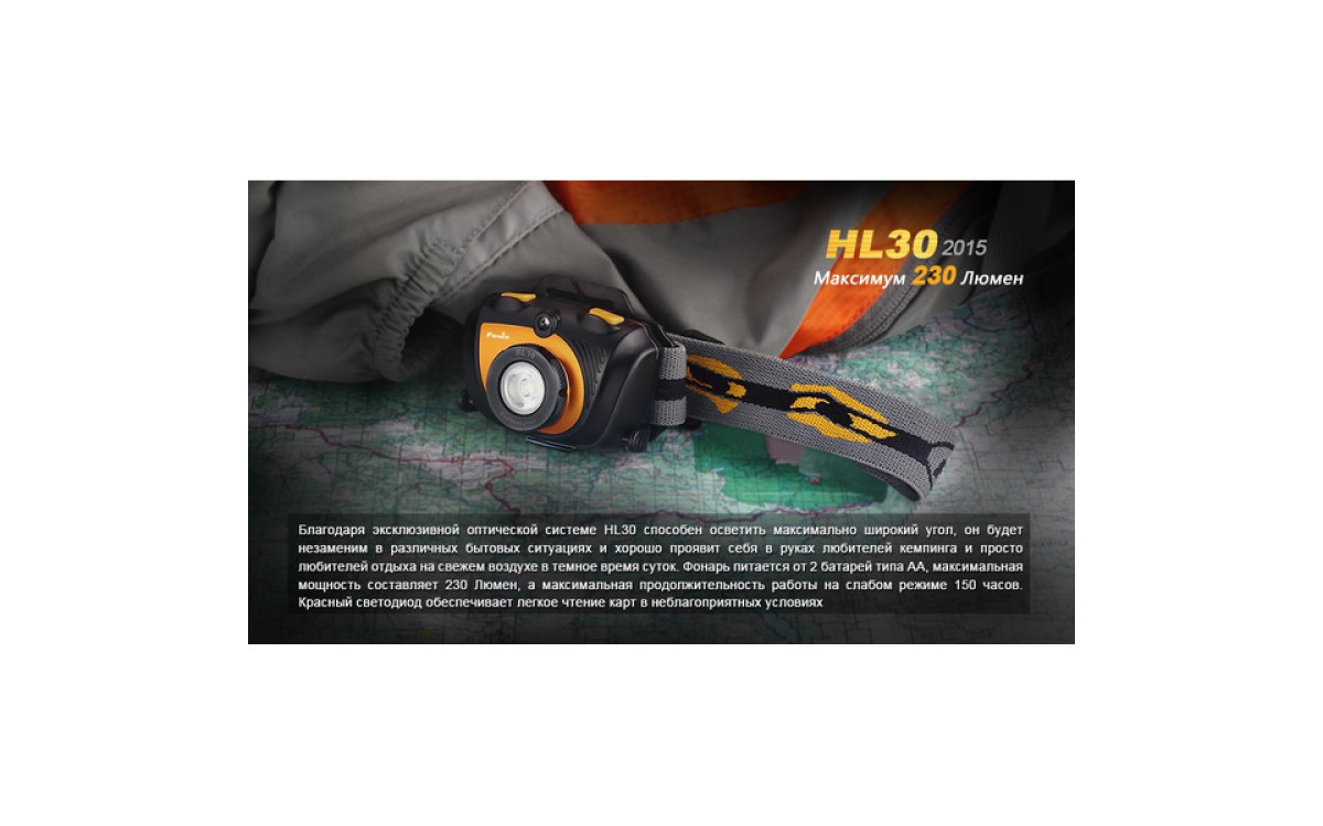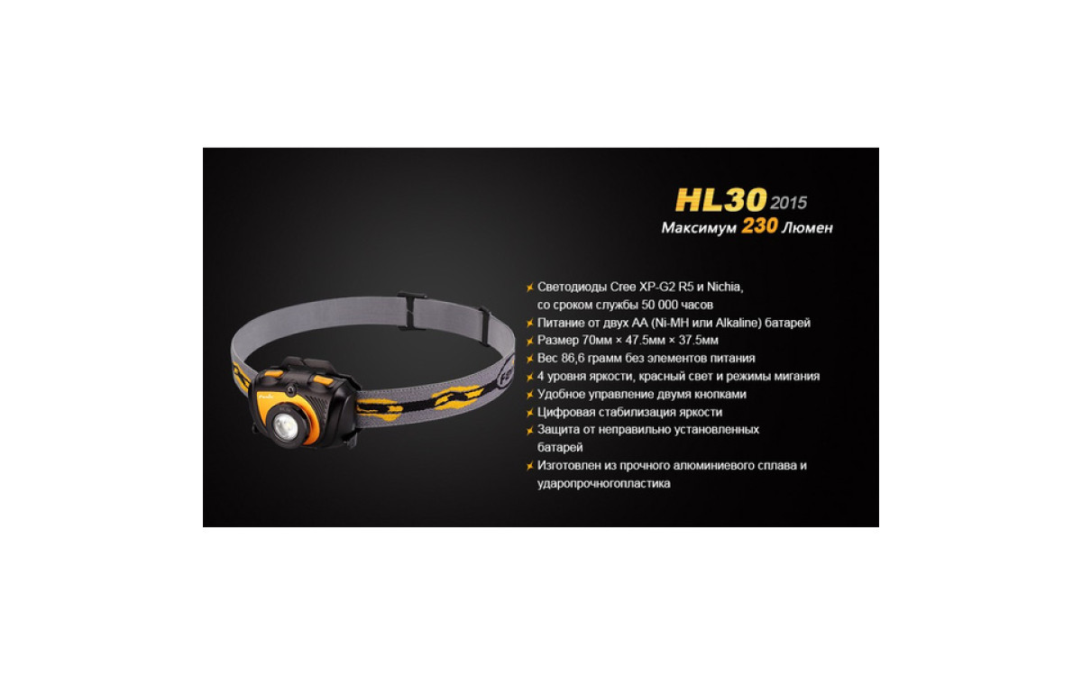 Максимальная яркость фонаря при работе от 2-х батареек АА составляет 230 люмен, длительность непрерывной работы — до 150 часов, максимальная дальность луча — 51 метр. Такие характеристики, как водонепроницаемость по стандарту IPX-6 и интегрированный дизайн, способны сделать нахождение на открытом воздухе вместе с Fenix HL30 (2015) комфортным в любых условиях.