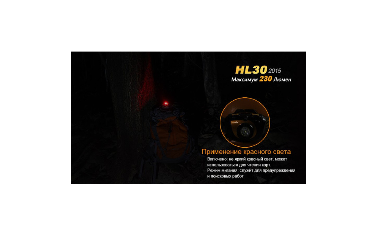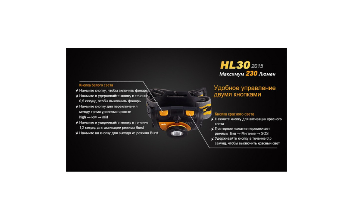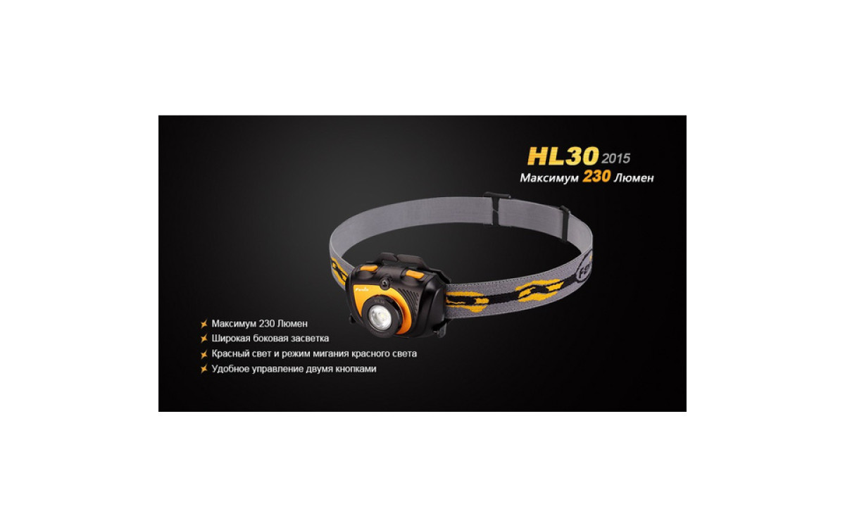 Fenix HL30 (2015) — это налобный фонарь с двумя источниками света высокой интенсивности. Обладая 3-мя удобными уровнями яркости и Турбо режимом, HL30 (2015) эффективен для решения широкого спектра задач. Для быстроты управления в фонаре имеется 2 кнопки, которыми переключаются режимы белого и красного света, а также сигнал SOS.