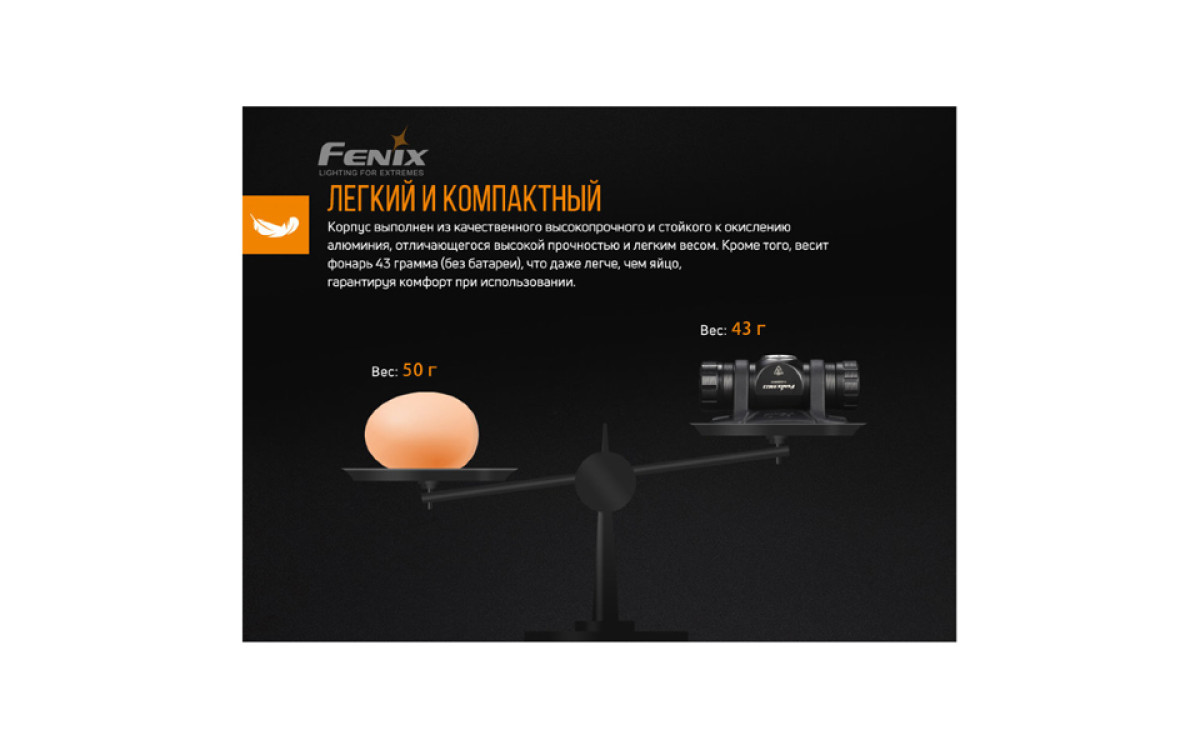 - Корпус фонаря повторяет форму элемента питания: одной батарейки АА с осветительной системой, встроенной в центральной части для оптимальной балансировки и регулировки светового потока.
