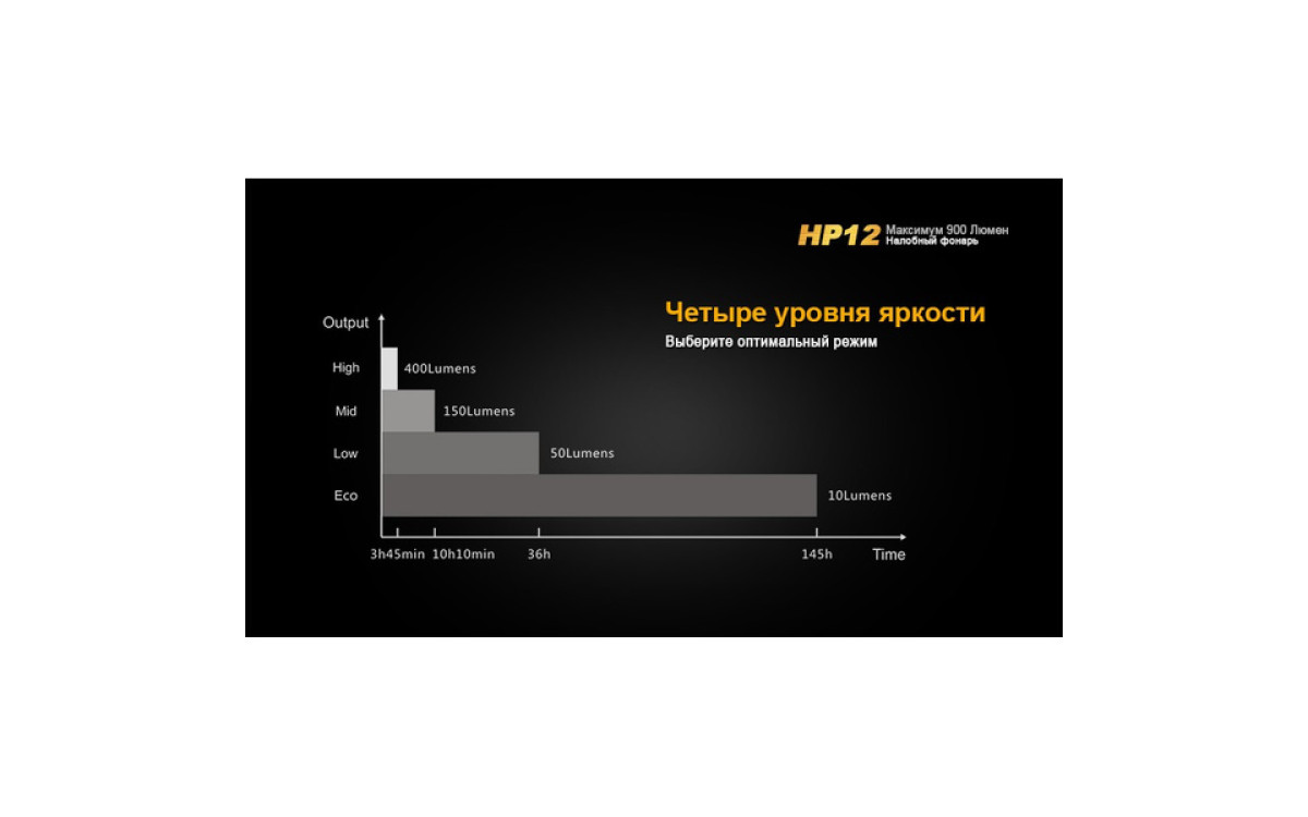 | Режимы и время работы: | burst максимальный средний минимальный | 900 люмен 400 люмен 150 люмен 50 люмен | - 3 ч 45 мин 10 ч 10 мин 36 часов |