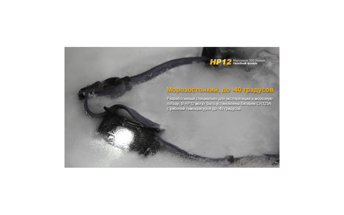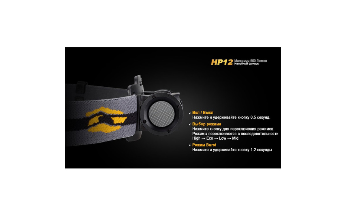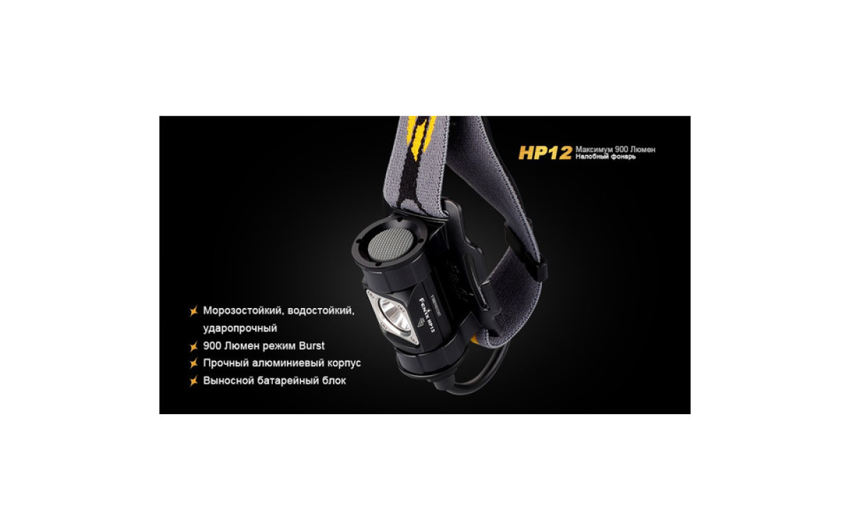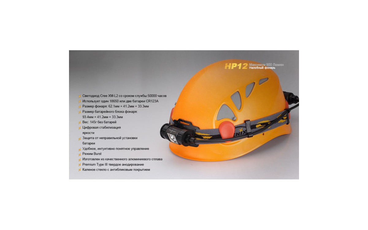 Мощный водонепроницаемый налобный фонарь HP12 обладает максимальной яркостью 900 люмен в Турбо режиме и дистанцией луча 123 метра. Отдельный батарейный отсек обеспечивает отличное распределение веса фонаря по голове, поддерживается работа от литиевых батареек CR123A и аккумуляторов 18650 Li-ion. Fenix НР12, с его прочным алюминиевым корпусом, водо- и пыленепроницаемым по стандарту IP68 - превосходный выбор для технических работ и динамичных видов деятельности.