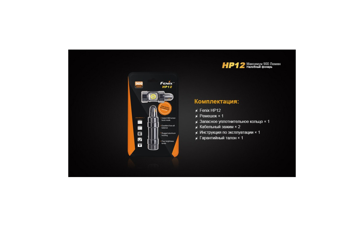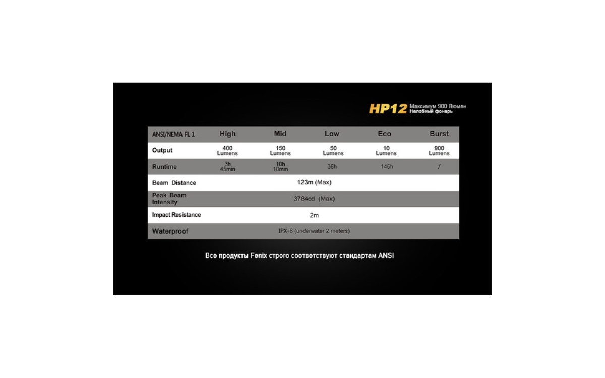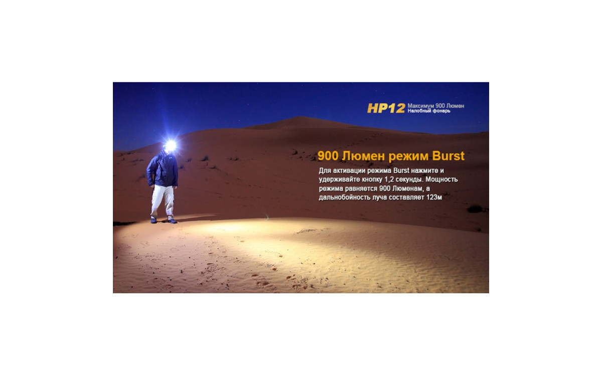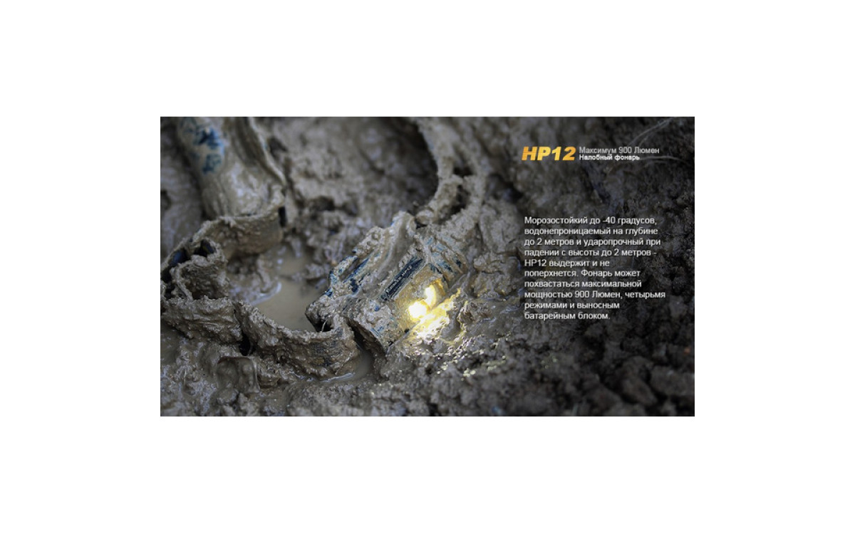 Мощный водонепроницаемый налобный фонарь HP12 обладает максимальной яркостью 900 люмен в Турбо режиме и дистанцией луча 123 метра. Отдельный батарейный отсек обеспечивает отличное распределение веса фонаря по голове, поддерживается работа от литиевых батареек CR123A и аккумуляторов 18650 Li-ion. Fenix НР12, с его прочным алюминиевым корпусом, водо- и пыленепроницаемым по стандарту IP68 - превосходный выбор для технических работ и динамичных видов деятельности.