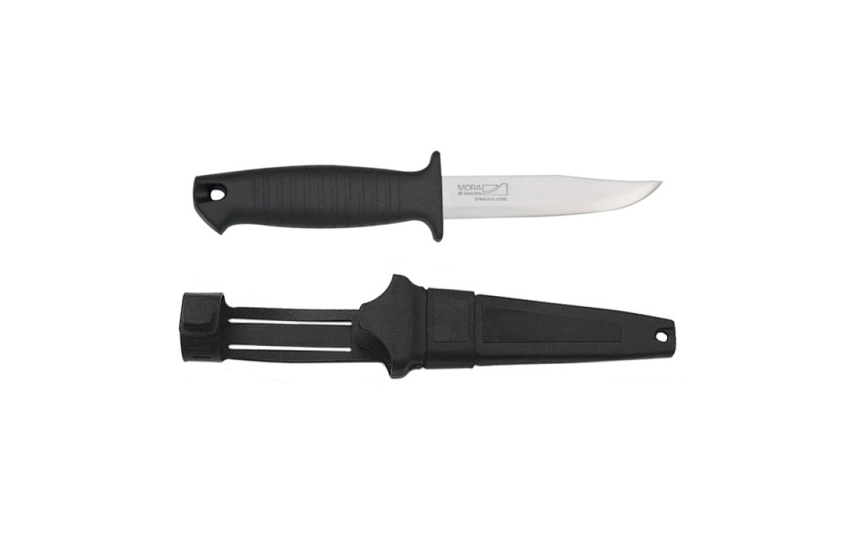 Шведский нож для туристов и рыбаков. Имеет пластиковую рукоять и комплектуется пластиковыми ножнами с креплением к поясу. Рукоять и ножны черного цвета. На ножнах имеется петля с резиновой кнопкой. Обух клинка не отшилифован.
