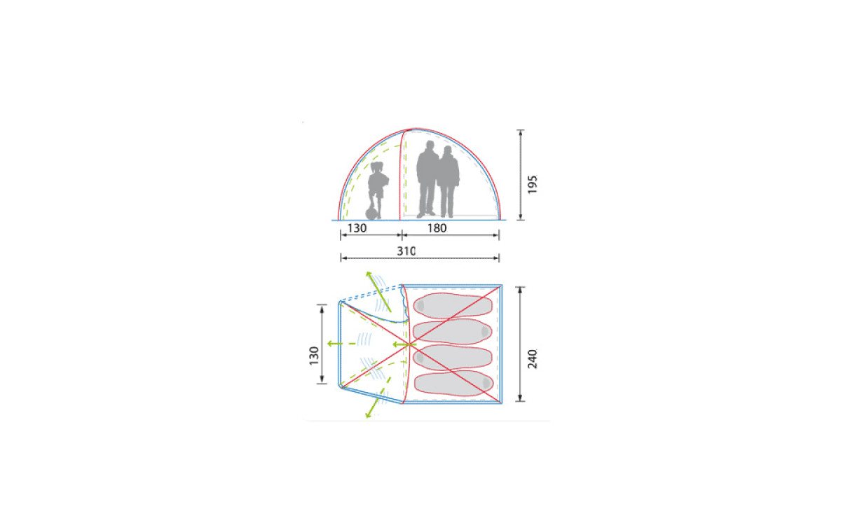 - Эффективная система вентиляции состоит из одного вентиляционного окна с ветровым клапаном, расположенного в верхней точке купола, и одного торцевого окна с внешней шторкой на молнии