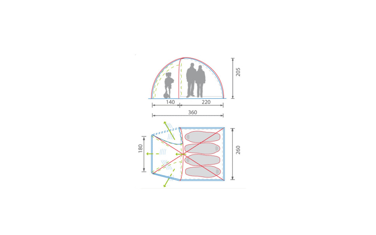 - Эффективная система вентиляции состоит из одного вентиляционного окна с ветровым клапаном, расположенного в верхней точке купола, и одного торцевого окна с внешней шторкой на молнии