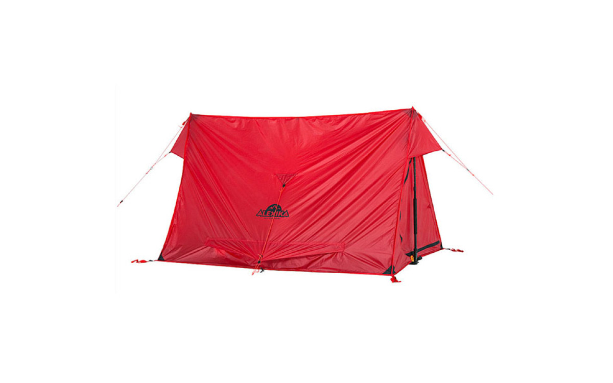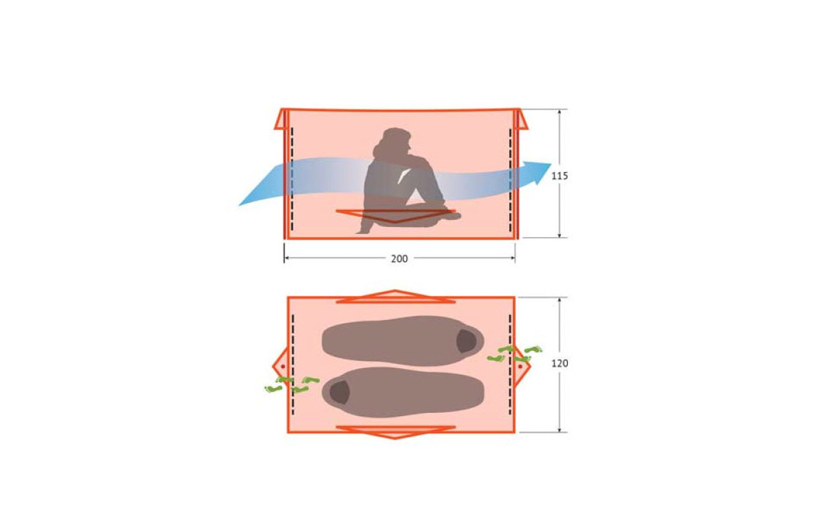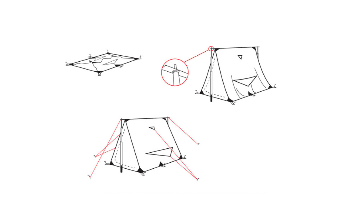Для установки этой бескаркасной палатки можно использовать телескопические трекинговые палки, ледорубы или растягивать (подвешивать) палатку за конек.