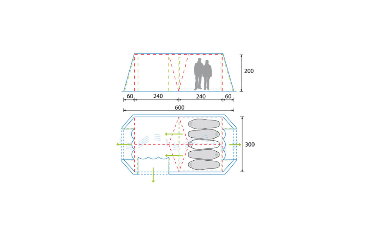 - Внутреннюю палатку можно разделить на две спальни 2+2 при помощи съёмной стенки.