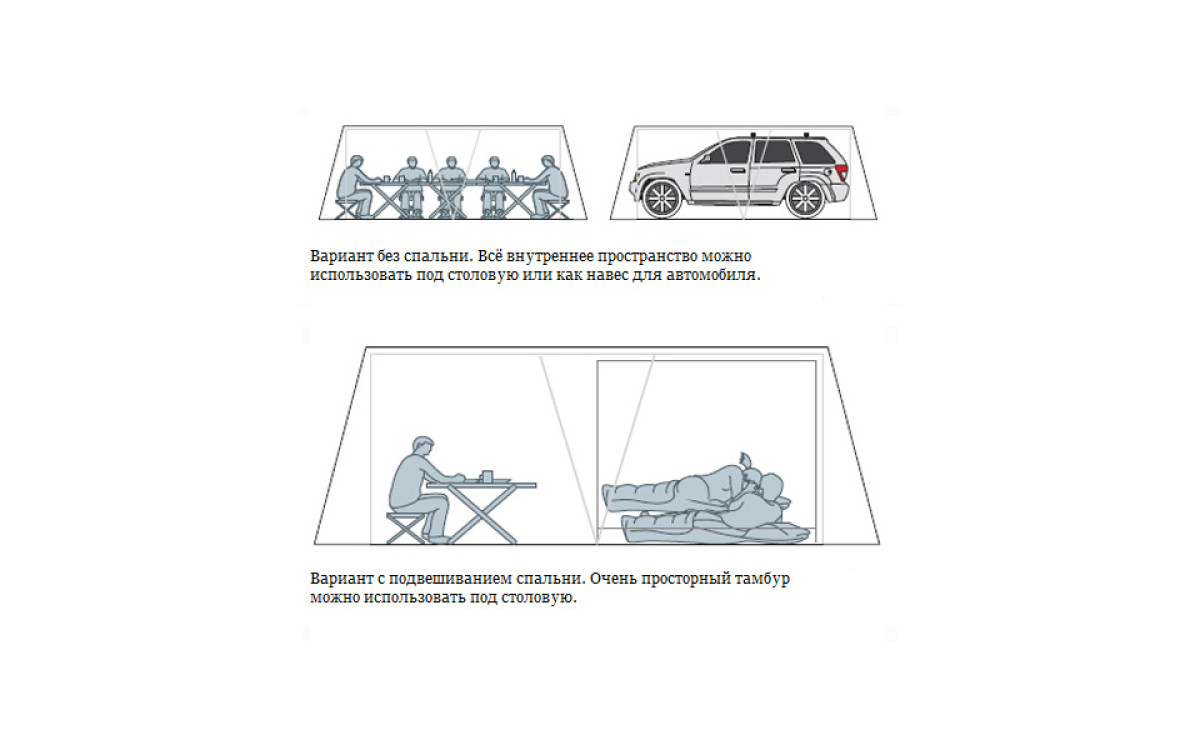 В комплект входит полный набор для организации внутреннего пространства: дополнительные стойки для пологов дверей, пол в тамбур и специальная перегородка, с помощью которой можно разделить палатку на 2 спальни.