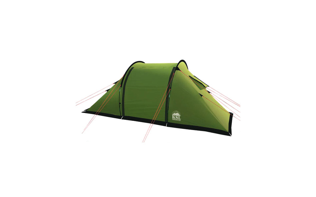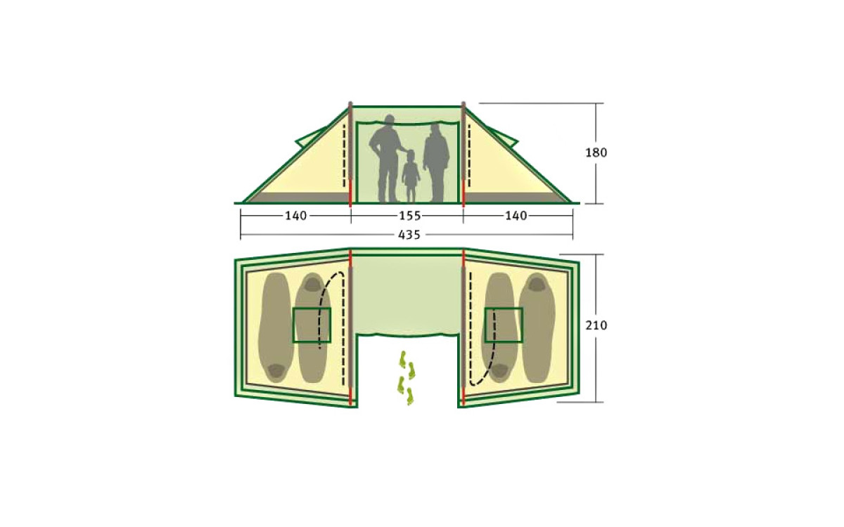 Классическая двухкомнатная (2+2) кемпинговая палатка с большим тамбуром посередине.