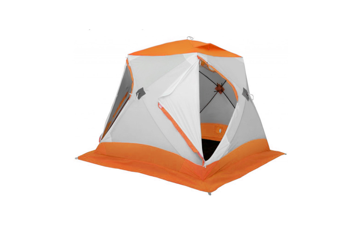 - Стенки каркаса расположены под наклоном к центру образуя форму палатки в виде призмы. Наклон стенок достигается за счет удлинения нижних боковых дуг каркаса, что позволяет значительно повысить жесткость конструкции и улучшить ветроустойчивость палатки.