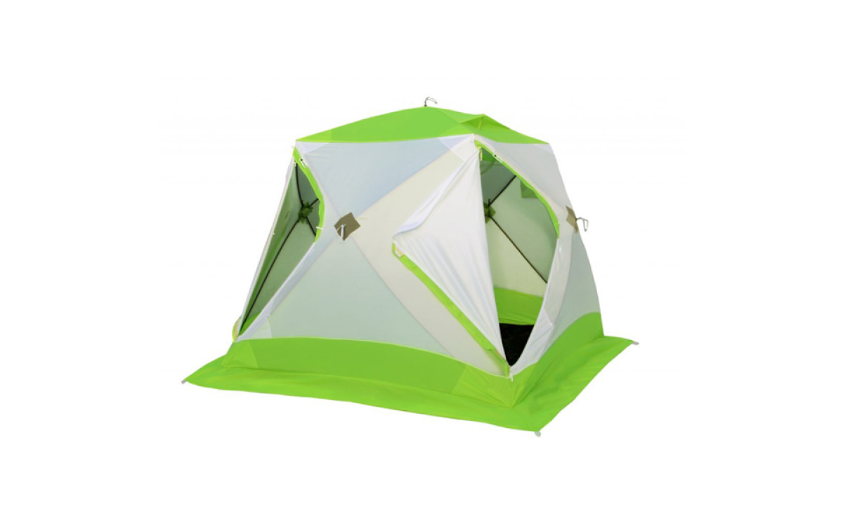 - Стенки каркаса расположены под наклоном к центру образуя форму палатки в виде призмы. Наклон стенок достигается за счет удлинения нижних боковых дуг каркаса, что позволяет значительно повысить жесткость конструкции и улучшить ветроустойчивость палатки.