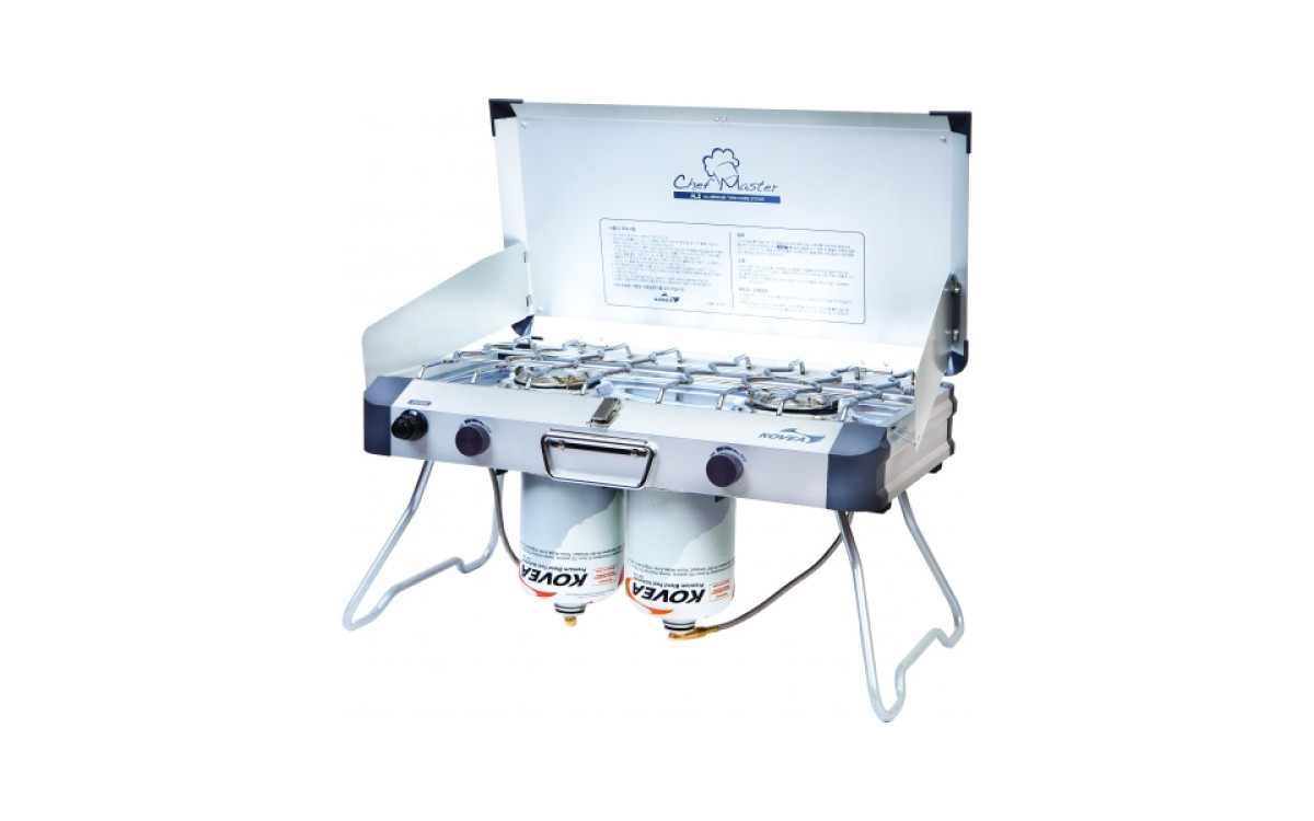 Профессиональная двухконфорочная плита класса Premium. Корпус плиты выполнен из авиационного алюминия, благодаря чему плита имеет малый вес, отсутствуют оплавляющиеся детали. Плита работает от двух баллонов резьбового типа 230 или 450 грамм, закрепленных в перевернутом состоянии, благодаря чему высокая мощность плиты поддерживается даже когда баллон подходит к концу и при низких температурах. Для более стабильной работы плита имеет систему предварительного подогрева газа-Anti-Flare System. Также имеются шторки от ветра и пьезоподжиг. В сложенном виде плита выглядит как алюминиевый кейс.