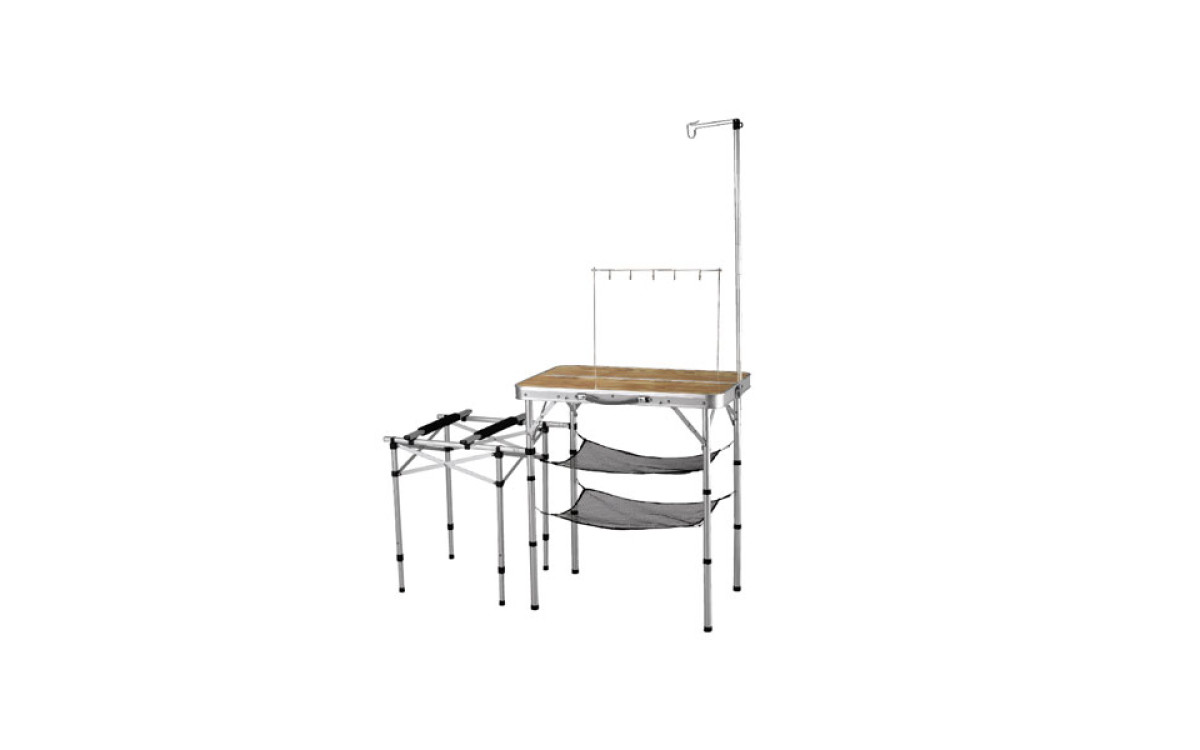 Прочная алюминиевая конструкция, стол с подвесными полками и держателями для аксессуаров, штангой для подвески лампы и подставкой для газовой плиты или BBQ модуля.