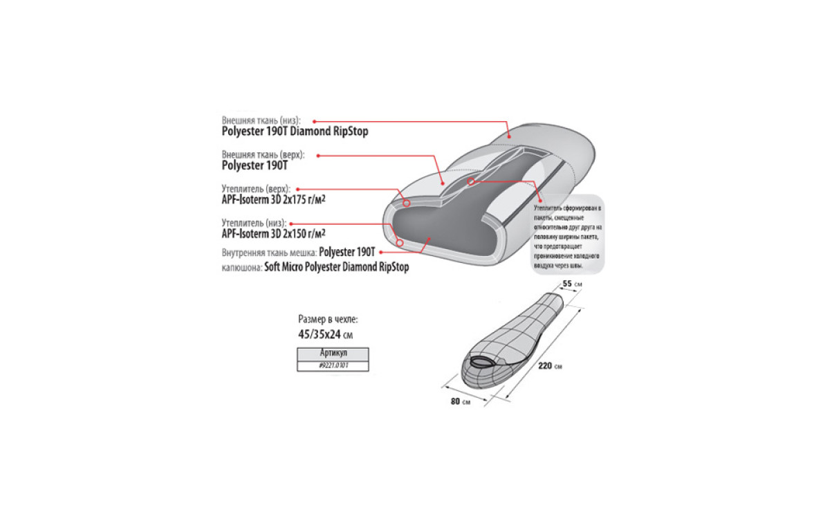 - концепция Protective Shell - защита от холода, ветра и влаги, долговечность спальника;