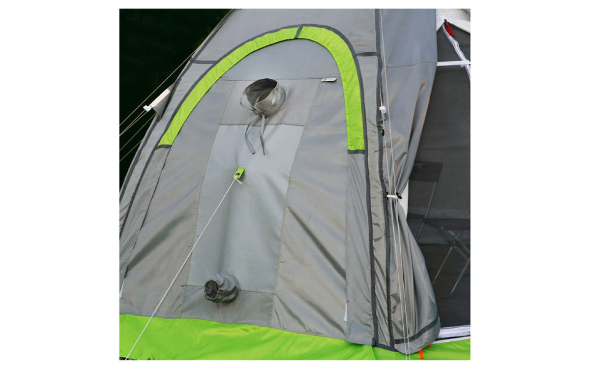 - Стенка герметично крепится к раскрытой палатке при помощи специальной тракторной молнии, установленной на D-образном входе палатки.