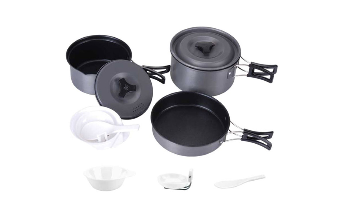 Туристический набор посуды на 2-3 персоны. Состоит из двух котелков с крышками, миски-сковородки, трех пластиковых чашек и двух ложек. Складывается по принципу матрешки.