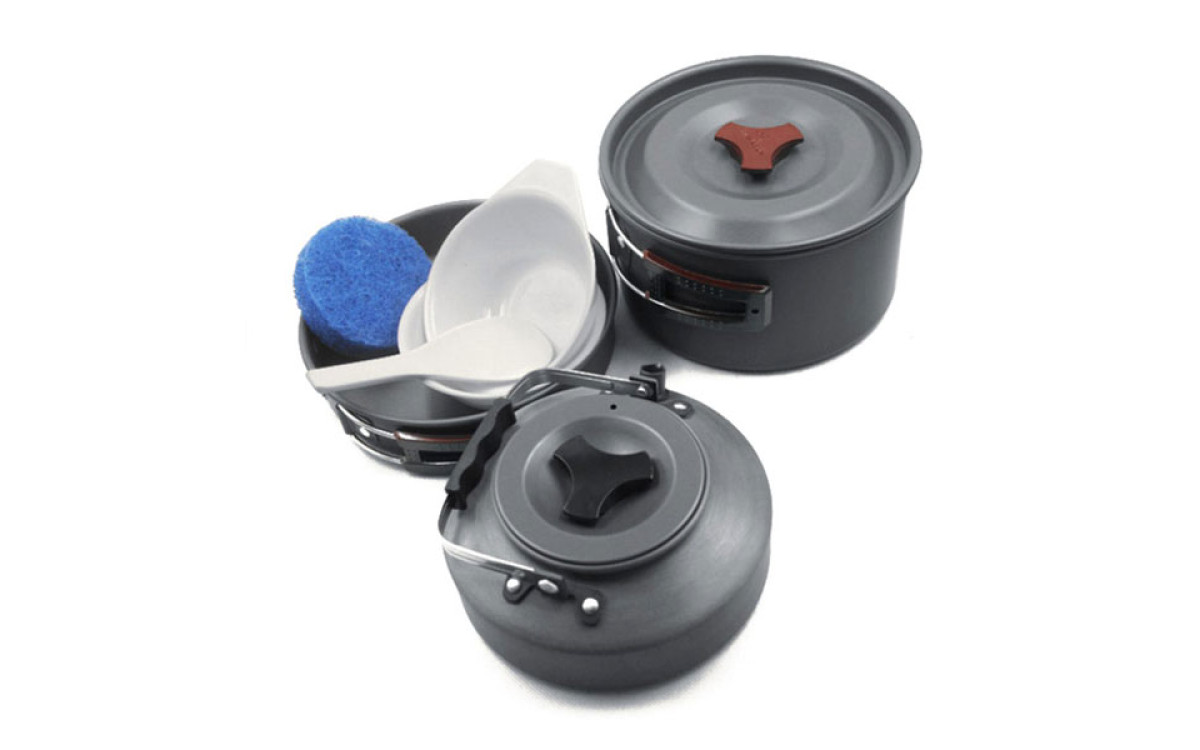 Туристический набор посуды на 2 персоны. Состоит из котелка с крышкой, миски-сковородки, чайника, двух пластиковых чашек и ложки. Складывается по принципу матрешки.