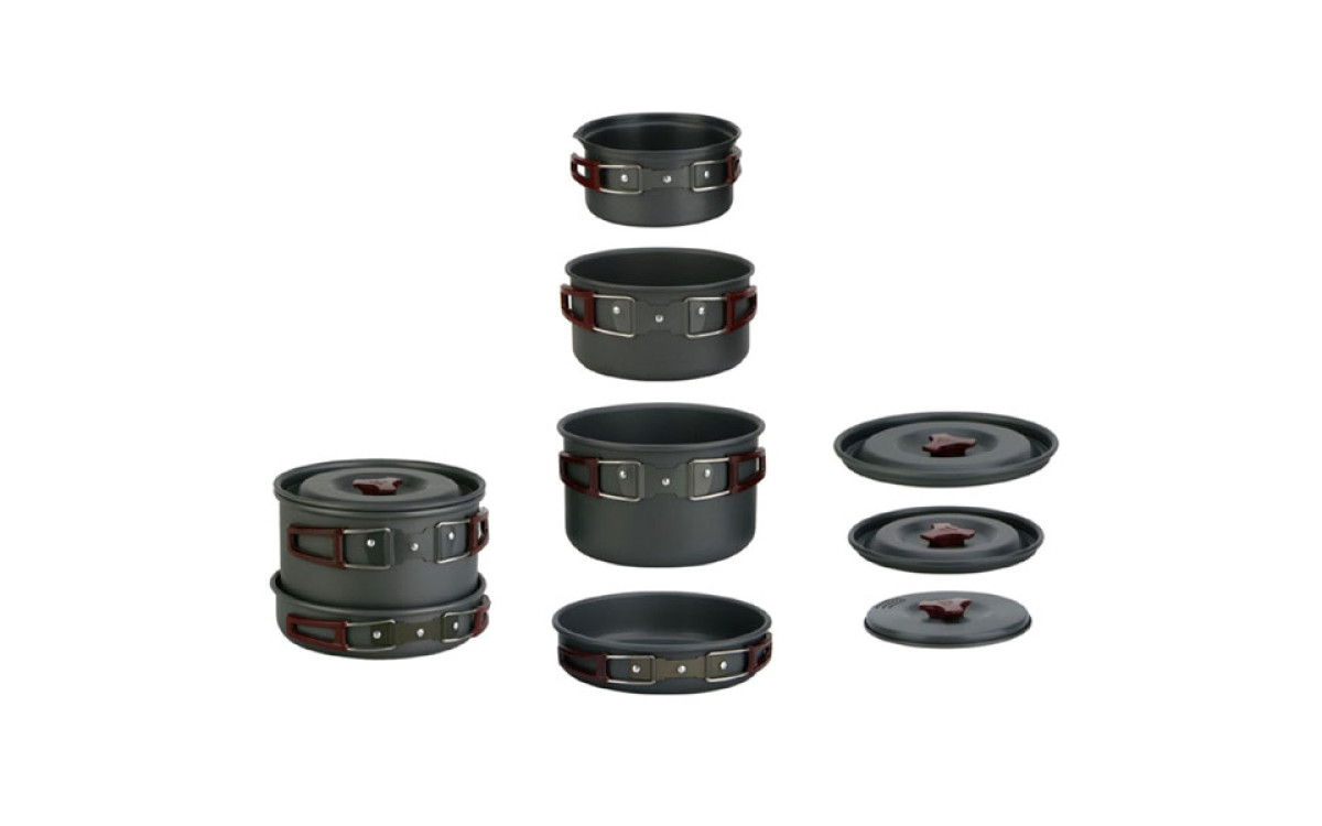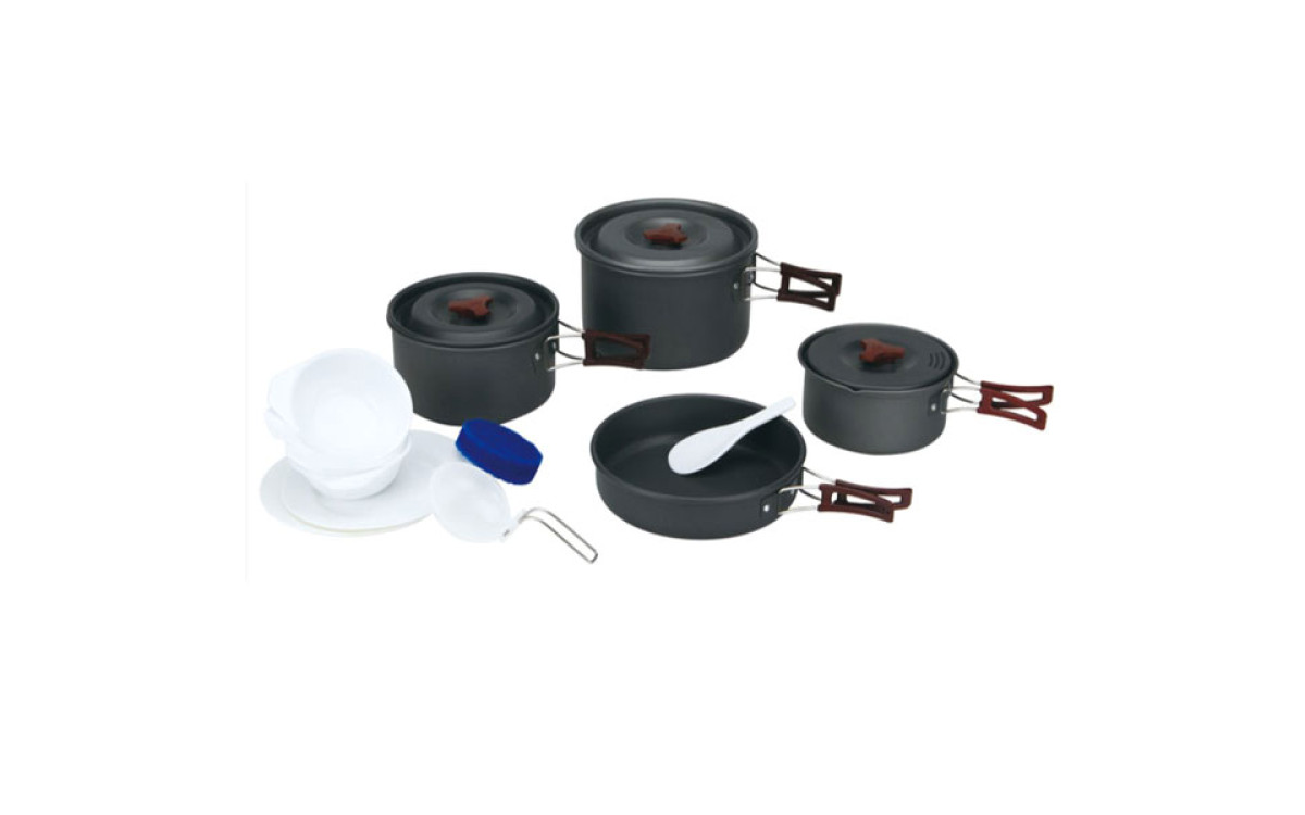 Туристический набор посуды на 4-5 персон. Состоит из трех котелков с крышками, миски-сковородки, пяти пластиковых чашек, двух тарелочек и двух ложек. Складывается по принципу матрешки.