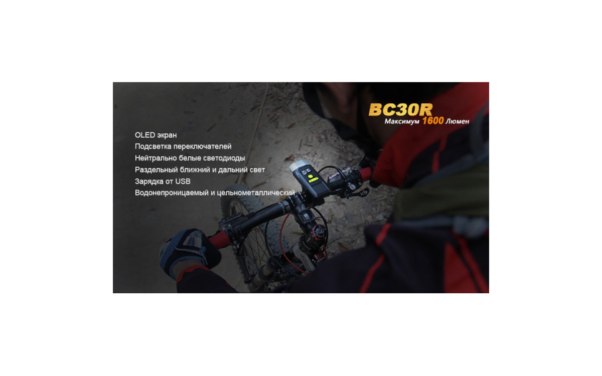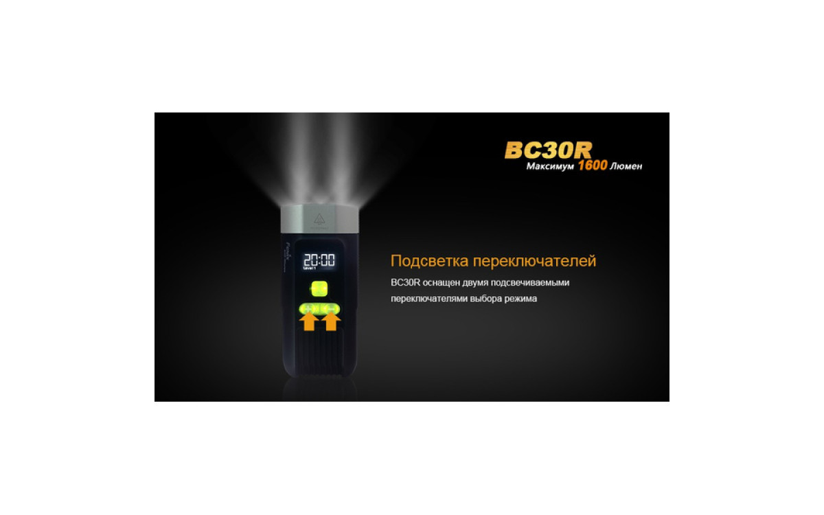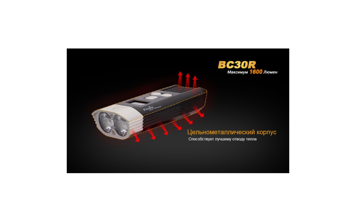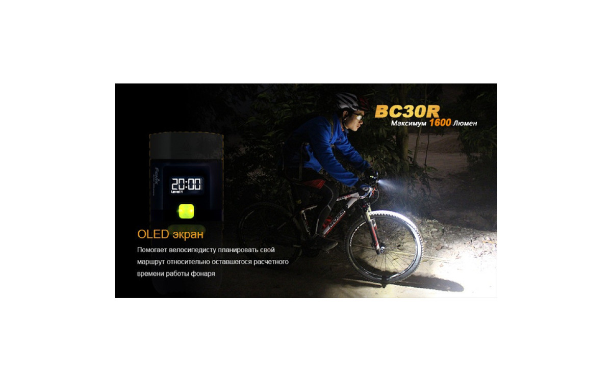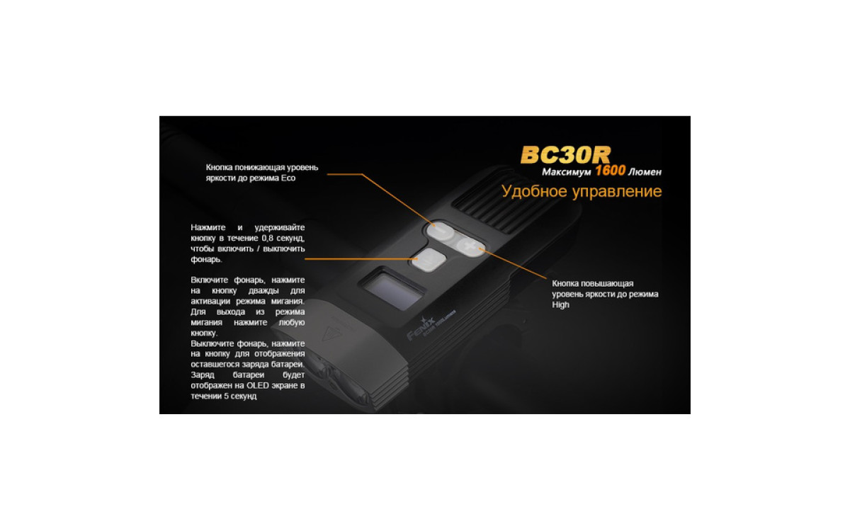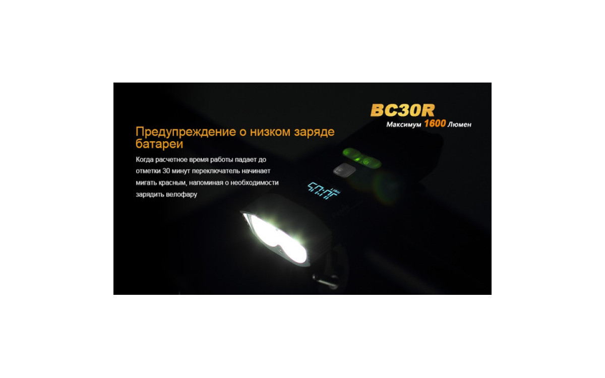 Аккумуляторная велофара Fenix BC30R обладает нейтральным белым светом c яркостью 1600 люмен, всегда готова к работе благодаря надежной конструкции и с возможностью зарядки от USB. Светодиодный цифровой дисплей помогает спортсмену контролировать оставшееся время работы и планировать свой маршрут. Дистанционная кнопка и система 2-х зонного освещения позволяют эффективно ехать как по дороге, так и по пересеченной местности с дистанцией освещения до 155 метров. Кнопка плюс/минус управляет 5 режимами яркости и сигнальным режимом. Велофара работает от встроенного аккумулятора большой емкости 5200 мАч.