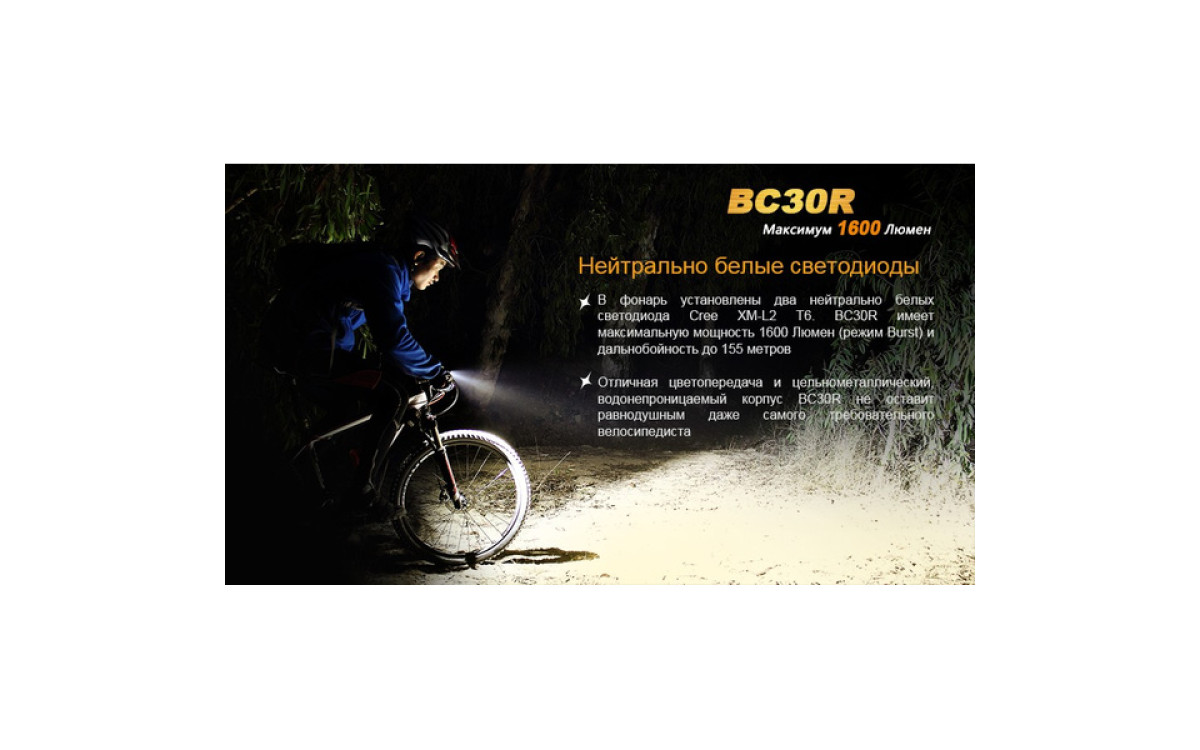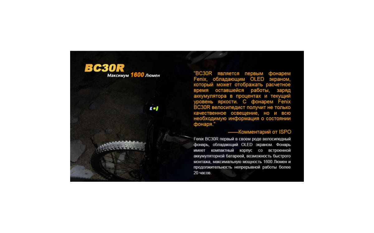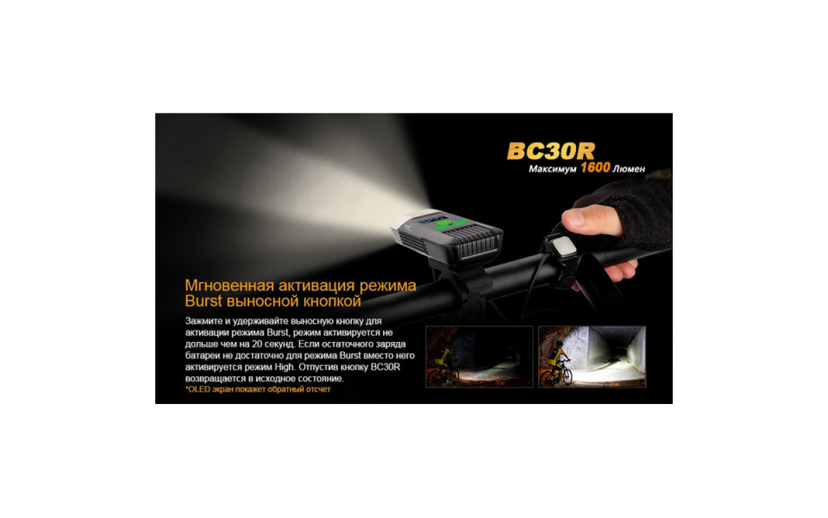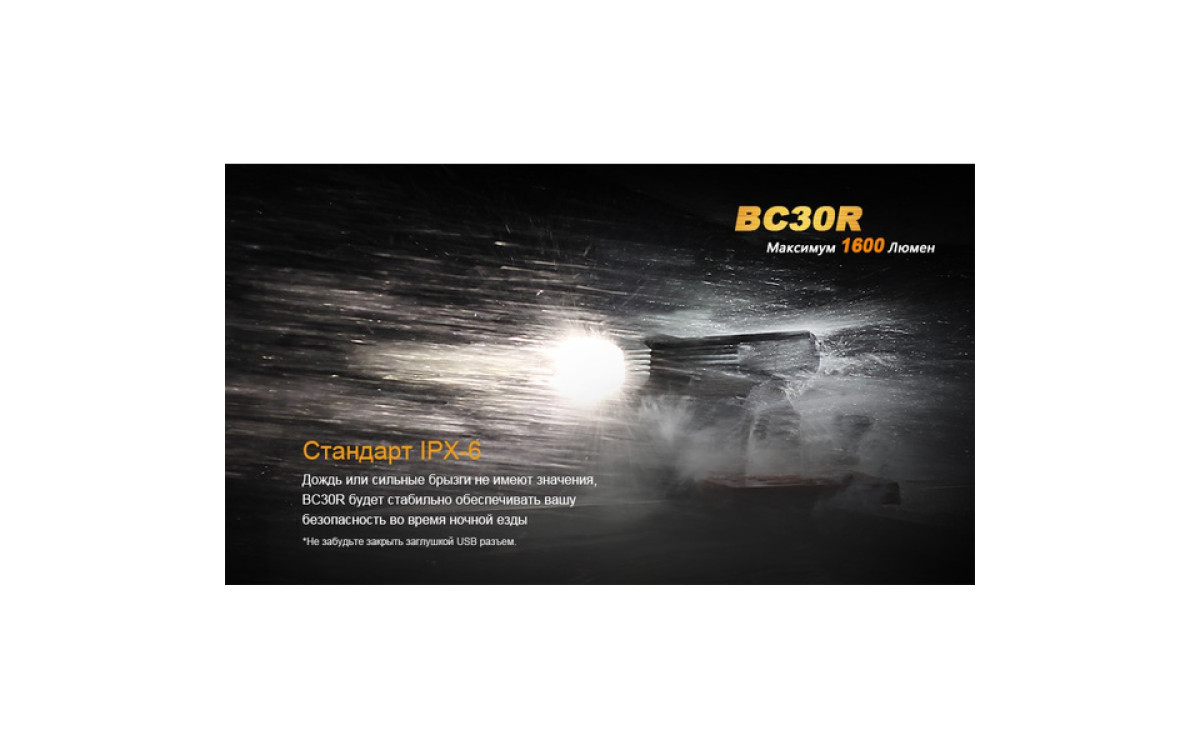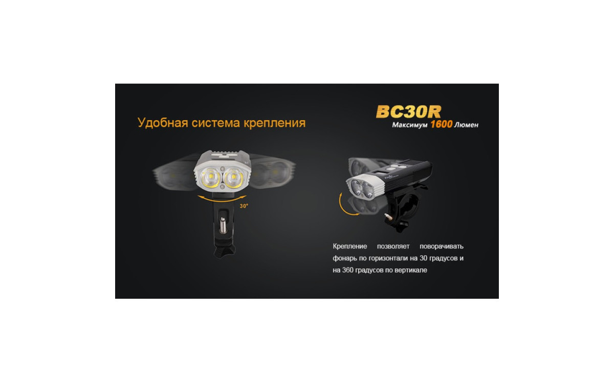 Аккумуляторная велофара Fenix BC30R обладает нейтральным белым светом c яркостью 1600 люмен, всегда готова к работе благодаря надежной конструкции и с возможностью зарядки от USB. Светодиодный цифровой дисплей помогает спортсмену контролировать оставшееся время работы и планировать свой маршрут. Дистанционная кнопка и система 2-х зонного освещения позволяют эффективно ехать как по дороге, так и по пересеченной местности с дистанцией освещения до 155 метров. Кнопка плюс/минус управляет 5 режимами яркости и сигнальным режимом. Велофара работает от встроенного аккумулятора большой емкости 5200 мАч.