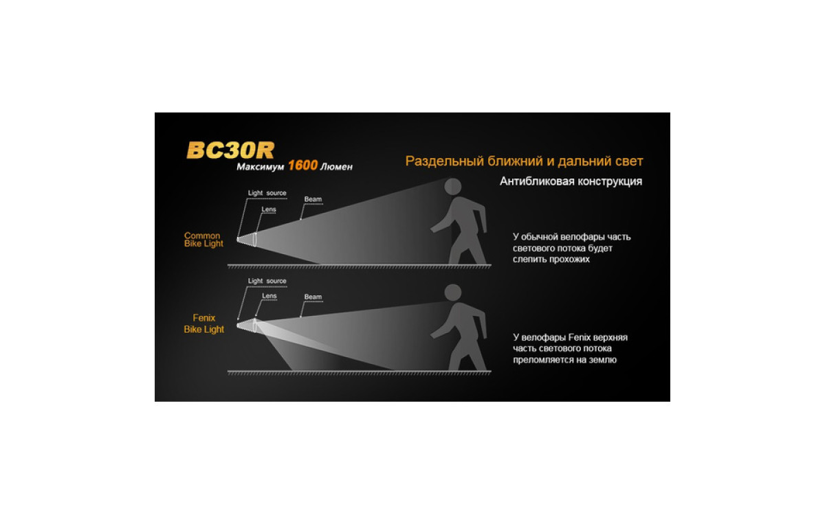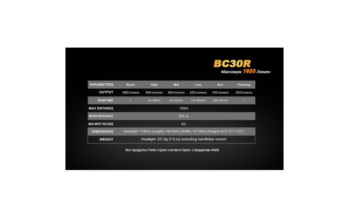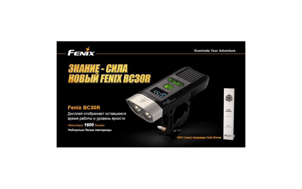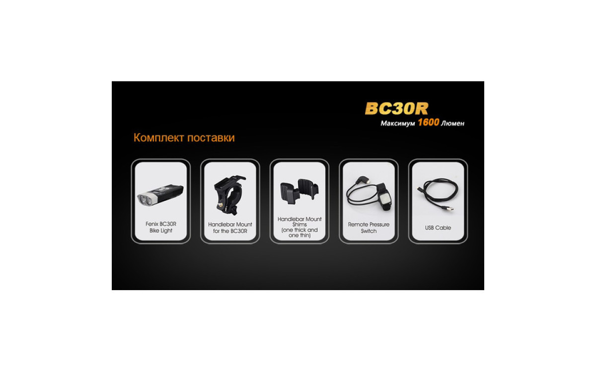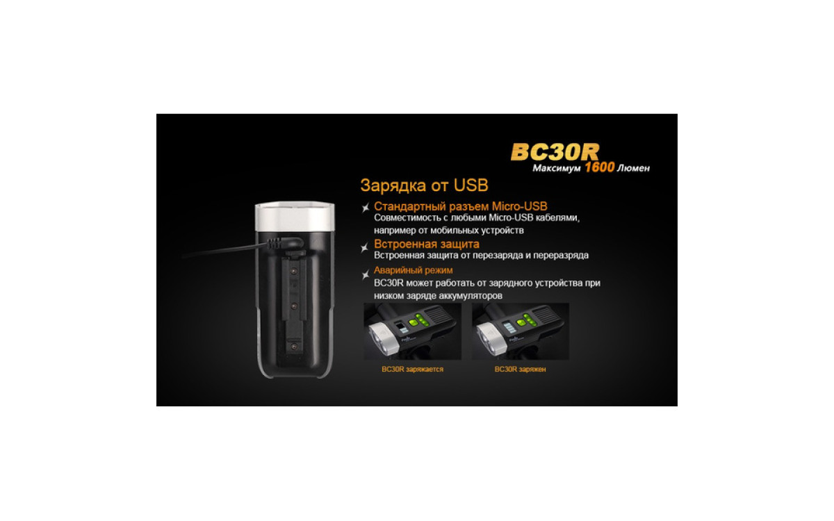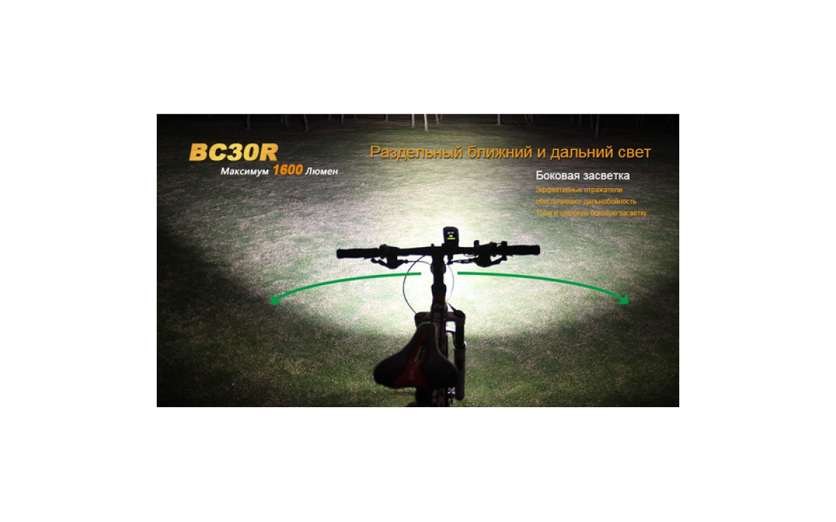 Аккумуляторная велофара Fenix BC30R обладает нейтральным белым светом c яркостью 1600 люмен, всегда готова к работе благодаря надежной конструкции и с возможностью зарядки от USB. Светодиодный цифровой дисплей помогает спортсмену контролировать оставшееся время работы и планировать свой маршрут. Дистанционная кнопка и система 2-х зонного освещения позволяют эффективно ехать как по дороге, так и по пересеченной местности с дистанцией освещения до 155 метров. Кнопка плюс/минус управляет 5 режимами яркости и сигнальным режимом. Велофара работает от встроенного аккумулятора большой емкости 5200 мАч.
