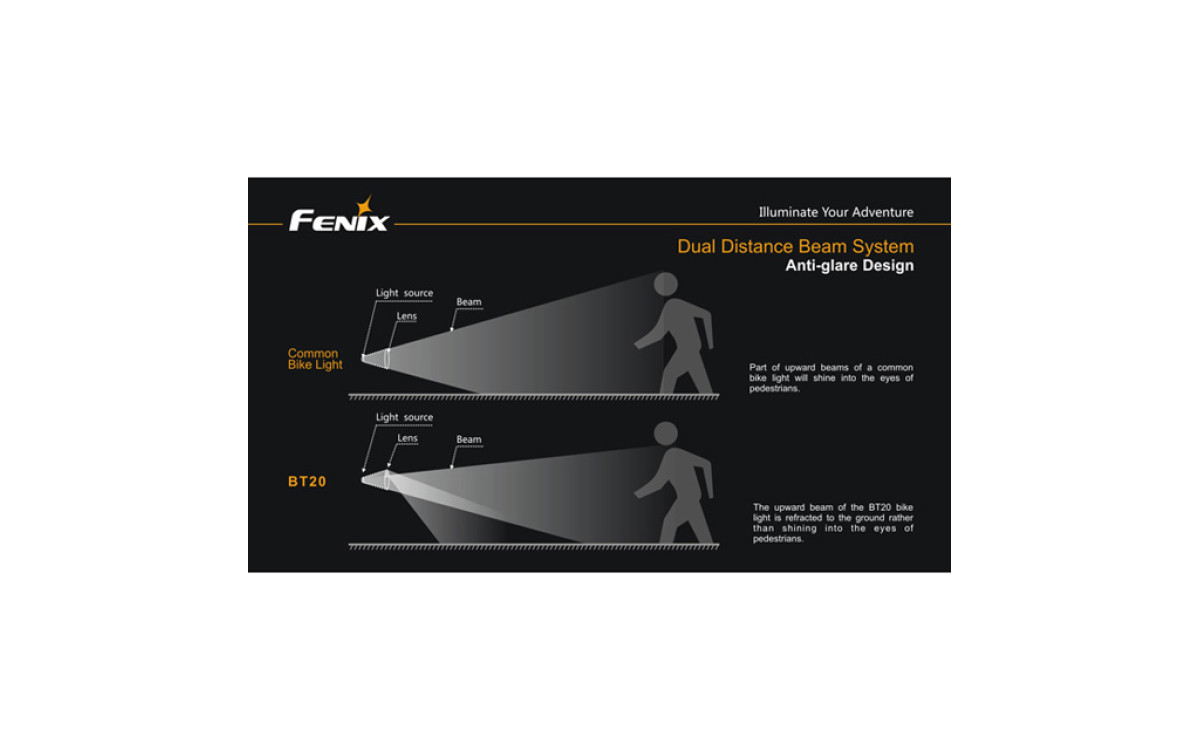 Это обеспечивает безопасность для различных типов езды: в горах, походах, на пересеченной местности и пр. Система 2-х зонного освещения: обширное прожекторное освещение создается благодаря асферическому строению отражателя. Дистанция луча прожекторного освещения более 150 метров. Верхний луч, преломленный линзой, формирует вспомогательное освещение непосредственно впереди велосипеда, вне зоны досягаемости обычной вело фары. Также этот луч не слепит встречных прохожих, он направлен под колесо и преломляется от земли, не попадая в глаза прохожим.