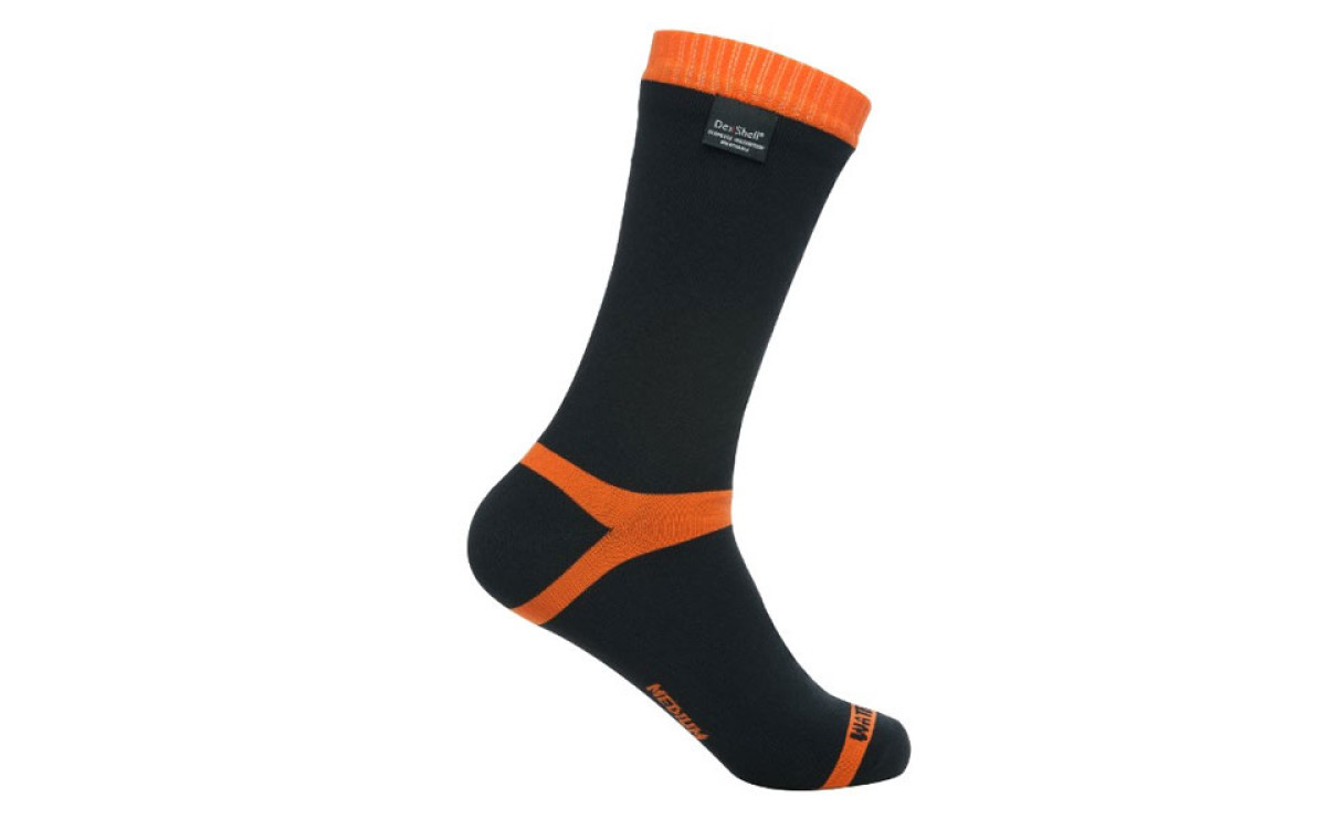 Модель DexShell Hytherm Pro представляет собою полностью водонепроницаемые носки высотою до середины голени. Их цвет — черный с оранжевыми резинками и вставками в области пятки и пальцев.