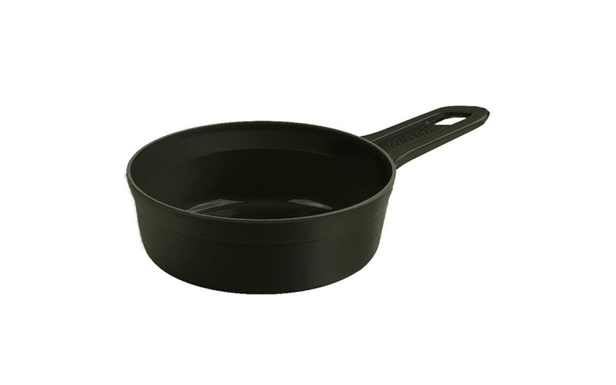Снабжена мерной шкалой до 0.8 л. Ручка широкая и удобная с отверстием для крепления.