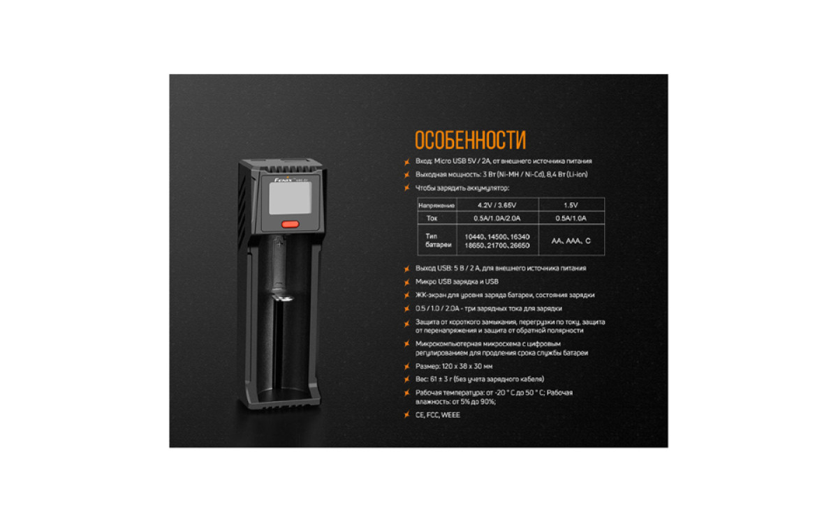 - Модель Fenix ARE-D1 без кабеля весит 61 г. Это компактное зарядное устройство длиною 120 мм, шириною 38 мм и высотою 30 мм. Оно хорошо работает при влажности воздуха 5%-90% и температуре от -20 С до +50 С. При нормальных условиях использовании Fenix ARE-D1 не нагревается более, чем до 55 С.