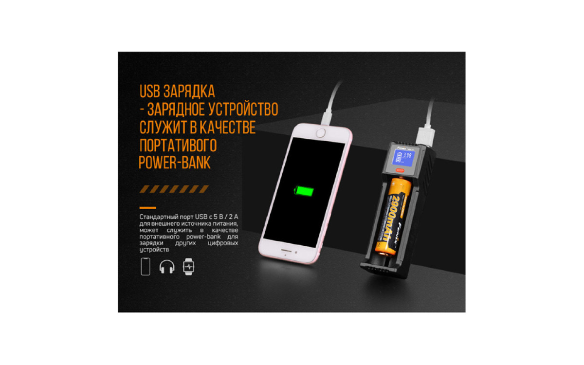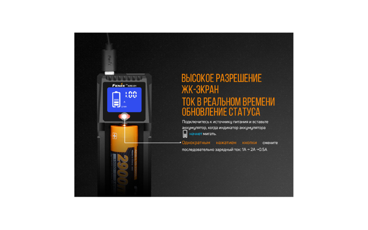 - Для модели Fenix ARE-D1 предусмотрена еще одна важная функция – разрядки аккумулятора. Она позволяет использовать устройство с установленным элементом питания в качестве power-банка. Работает функция исключительно с аккумуляторами на литиевом электролите. Максимальный ток на отдаче - 2А.