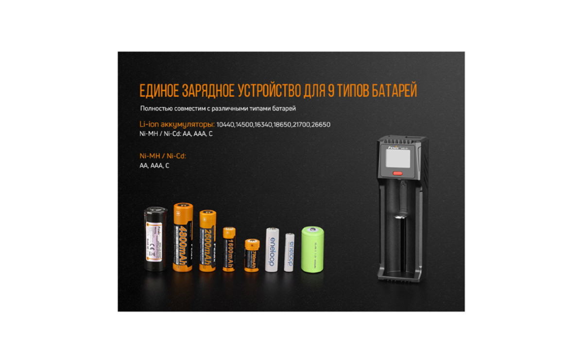 - Fenix ARE-D1 в состоянии работать с литий-ионными аккумуляторами и моделями на основе никеля: никель-металлгидридными и никель-кадмиевыми. Это такие 9 типоразмеров: АА, ААА, С, 14500, 18650, 10440, 16340, 21700, 26650. Каждый из аккумуляторов, несмотря на различия в размере, надежно фиксируется внутри слота за счет подвижной прижимной пластины. Зарядное устройство самостоятельно определит после установки аккумулятора его тип, оценит текущий уровень заряда, напряжение.